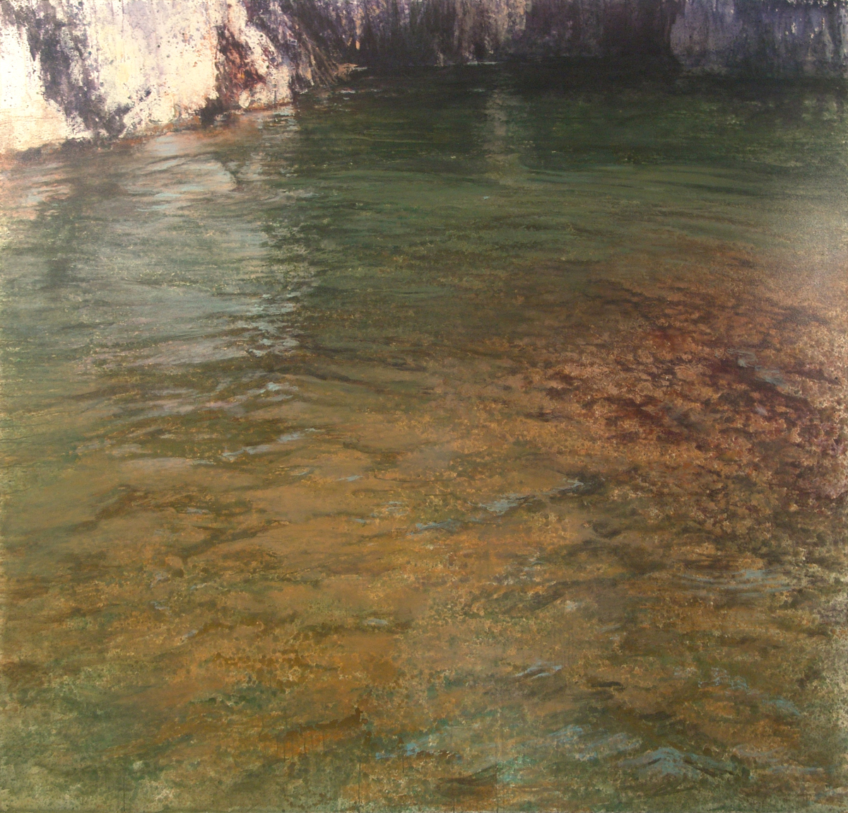THERE are so many elements that converge in Chryssa Verghi’s art. Among her painted odes to nature, you will spot references to certain crucial crossroads in the history of art and landscape painting, such as her painted encomium to Monet ‘s ‘ Water Lillies’, a touch of Romanticism’s passion for the sublime and mystical in nature, Expressionism’s painterly flair, or even Pollock’s love of paint drops. Nature here is a life giving force to be celebrated and respected – the mother of all things. Verghi captures via paint, how nature can uplift you, embrace you, soothe you, astound you with her colour and light, but then again how she can lure you into dark and dangerous places – musty and dank. After seeing her work, one is almost left with an after taste or an aroma – the musty smell of fig leaves, of damp earth, verdant vegetation or undergrowth feeding off nearby cool ,crystalline waters. The myriads of blues, greens and browns of her larger canvases in particular, play havoc on your eyes, excite the senses, detoxify the mind and boldly confront you with a powerful force.