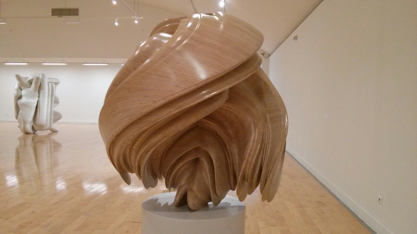 Now back to the exhibition… If you ever wondered what it would feel like to travel through time at the speed of light, then check out Cragg’s ‘The Runner’, where the human body has turned into a dynamic zig-zag of negative and positive space. Is there a connection with Varotsos’ glass ‘Runner’ one wonders? Have you ever seen the way a willow tree moves in the wind? Cragg’s sculpture ‘Willow’ turns this motion into a wooden swirl. ‘Bent of Mind’ on the other hand presents in bright red wood how some of Cragg’s sculptures change as the viewer sees them from different angles – from one side it is a profile of a face, while from another angle, this is an abstract, biomorphic, totemic form that seems to defy gravity in the way it balances its disc-like components one on top of each other. And how about the ‘holy’ (as in full of holes) nature of the Jesmonite sculpture entitled ‘Sharing’? There must be a pun there…