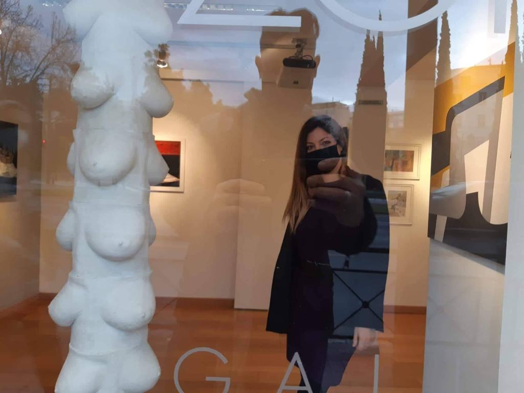 Although the gallery has had to close its doors due to the new measures, one look through its windows will allow passersby to witness the current show’s wealth of artistic creativity. Dominating the ‘round window’, is the sculptural work named ‘Female Plant’, by Kostas Lales, where one could say that the totemic nature of Brancusi’s work, has been given a surreal twist, seeing as its trunk-like form boasts a multitude of female breasts. Kostas Lales explains the concept behind the work: