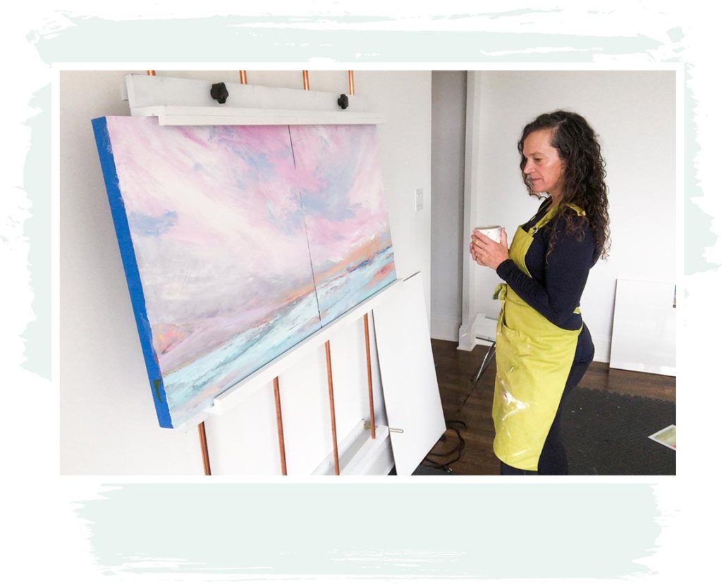 – I had always dabbled in all sorts of art. And that dabbling I suppose was a form of artistic experimentation, without realizing that art was happening!. And when I say art, I mean that interpretation loosely as I really believe that all forms of creative expression are linked and simply another form of communication. So as a student in grade school through university, I dabbled. In college I dabbled. When I was an elementary teacher and counselor I dabbled. The dabbling involved classical art classes, but it also involved photography, writing, creative work experience, and ways of traveling and seeing the world, creative ways of teaching or of counseling. I think I always approached things from the standpoint of wide-open possibilities…and that is exactly how I approach my art now! So when my own children were teenagers, and I asked my self-“what next?”, the common thread, was my need to create and express myself. And then when I discovered working with oil and cold wax and creating abstract art- a whole entirely new world of possibilities opened up, and I’d say that was the turning point to really dive in and commit myself to the process. I traveled to Ireland to study the process of creating abstract art with cold wax and oil paints in depth and the rest is history!
