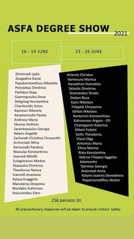 - Part 1 of the ASFA degree show ran June 16-19. Part 2 of the ASFA degree show runs June 23-26, Wednesday-Friday 2-10pm, Saturday 2-9pm. ASFA is on 256 Pireos Street. http://www.asfa.gr