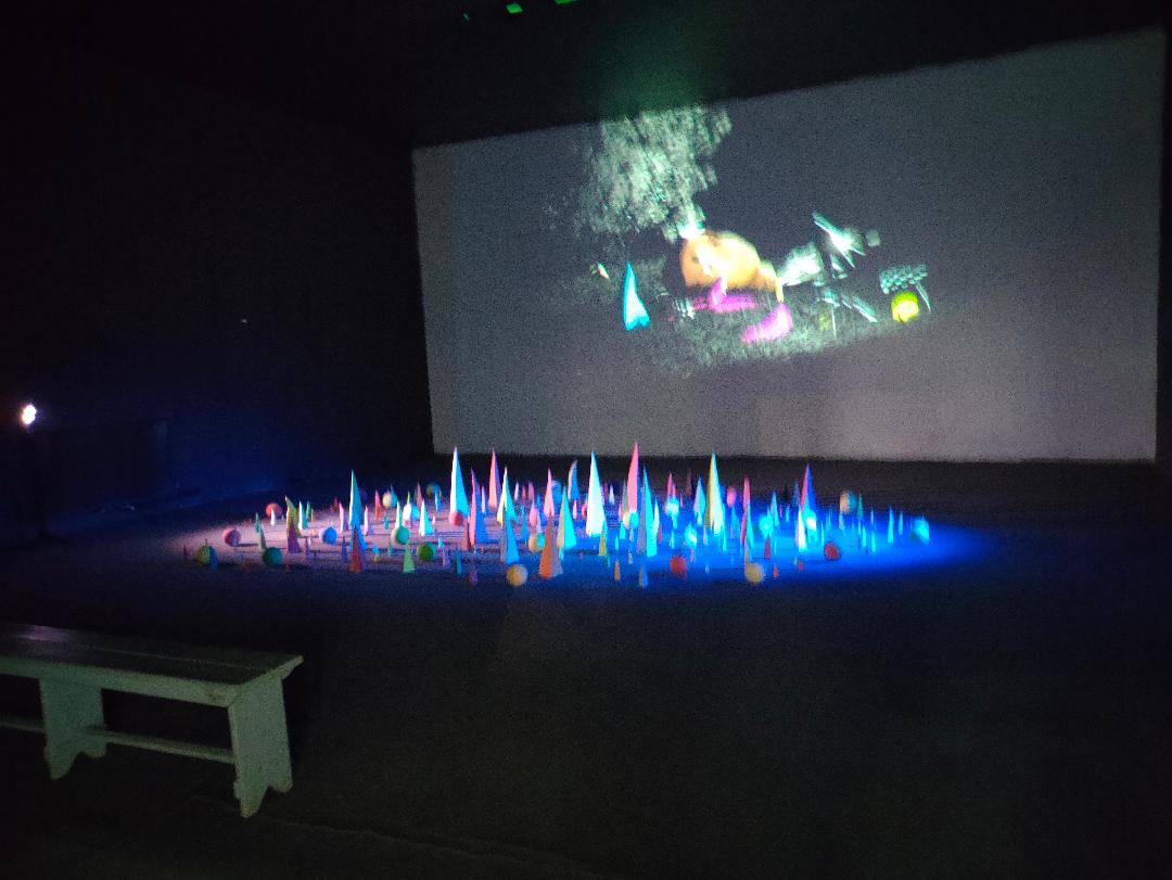 Pandora Kartsonaki’s installation on the other hand, had us peering into a dark interior, where pastel-coloured ceramic balls and triangles formed a kind of cityscape on the floor. Behind them, scenes from a dystopian world were being screened. Her installation, called ‘Pandora’s Box’, examines the notions of good and evil, what we perceive as negative and positive, inspired in part by our experience of the pandemic.