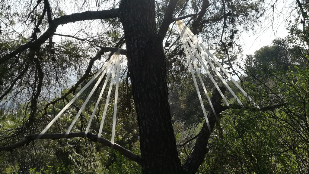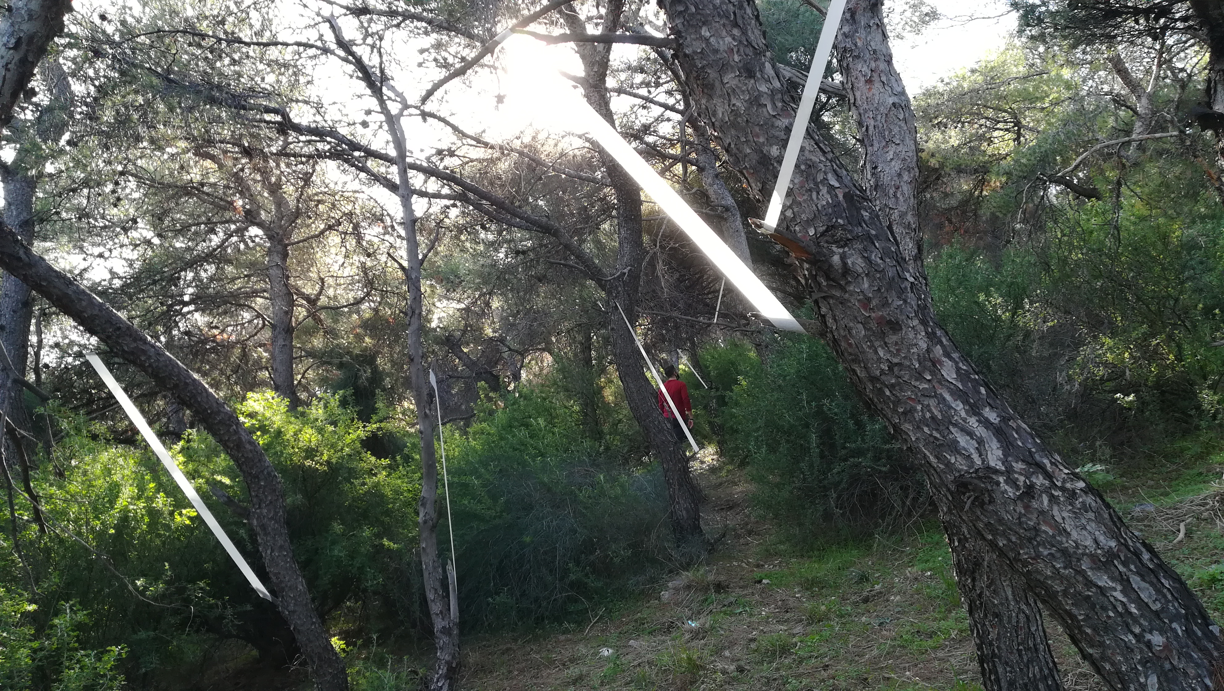 Whilst out walking and jogging, for over a period of about four months, Voulgaris created ephemeral geometric works that interacted with the natural pine forest environment: sometimes reflecting light, sometimes becoming transparent and sometimes disappearing. The radial arrangement of work was done using paper tape, which after a short period of time was removed and recycled for use the next day. The play of light, the recording of time, steps and paths, as well as the contact with both nature and other citizens enjoying nature were the main elements of this public work of art that uniquely reflects the special conditions of the lockdown period.