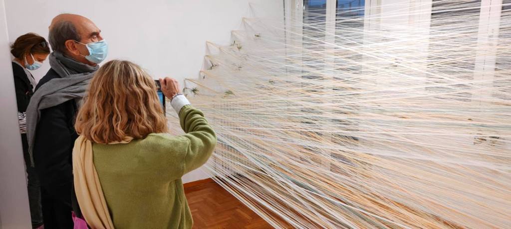 Via a series of photographs and videos, together with light effects and recordings of the sounds of Lycabettus, the documentation of these art interventions have been presented in the one room of Fokianou, as an art installation comprising of hanging photographs, reminiscent of mobile sculptures in space. Flora from the hill has also been added, together with light effects and sound recordings of Lycabettus Hill’s nature, such as the tweeting of birds. In another room, one encounters ‘The Slope’: an installation made of 25 kilometres of thread which criss-crosses the room, suspended in mid-air and held in place with hooks on the walls and floor. In its path, again pieces of foliage may be found, while a snake-like light lies on the floor. The threads are the colours of different grasses (yellows, greens, ochres, orange), and they change appearance according to the light of day. They create a sense of aerial perspective, seeing as the ones closest to the viewer are bolder in colour and appearance, while the ones in the distance are more faded. Many viewers enjoy sitting under the installation and viewing the criss-crossing threads from this perspective.