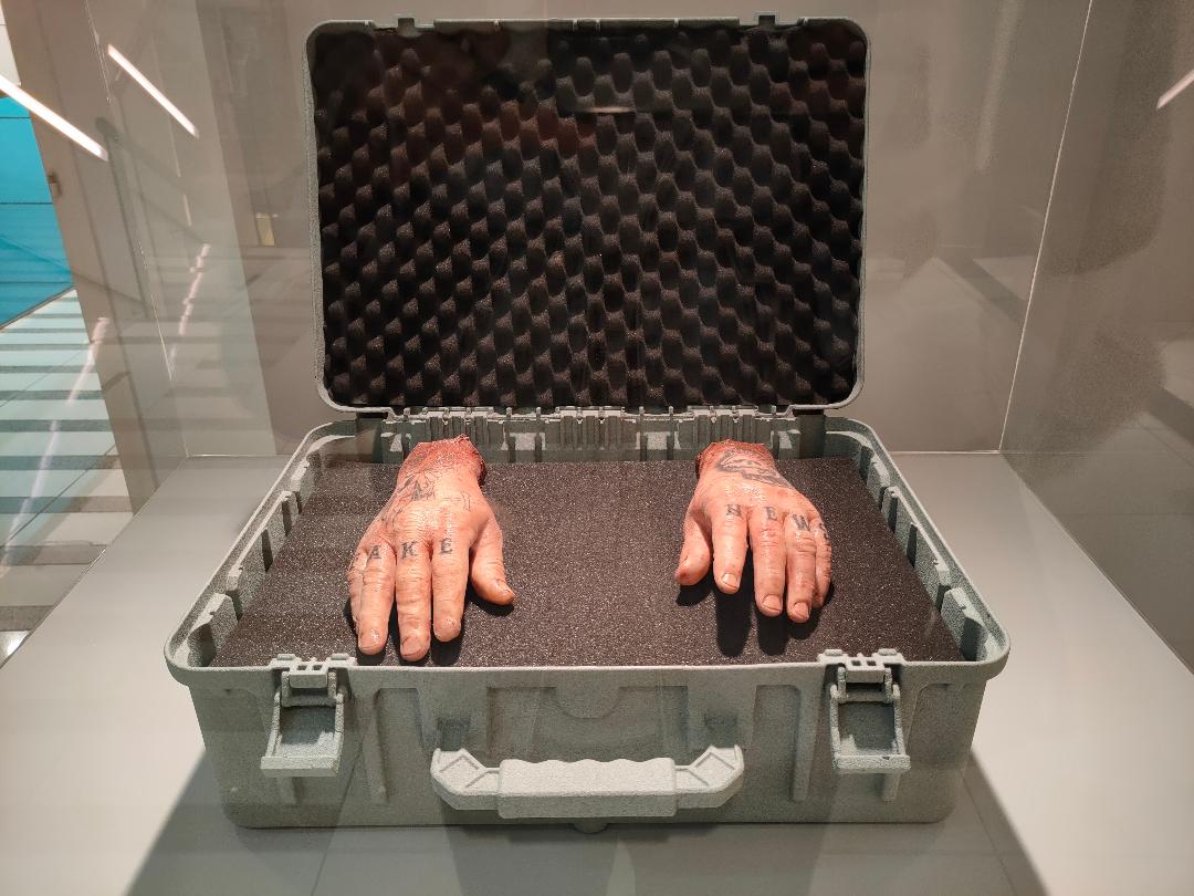 So, what was our experience like? Here are just some of the highlights: Totally enjoyed the works of Andrew Roberts that were interspersed in the Fokas building, and which were totally in sync with our Halloween mood… his chopped hands with the ‘Fake News’ tattoo, chopped tongues tattooed with symbols, and chopped foot tattoed with the Nike symbol were so life-like, but also sent poignant messages. Huntrezz Janos’ multiplayer environment accompanied by 3-D printed armour (‘Eclipsatrix Exuvia’ parts 1 and 2), were also impressive, as were many other works in the exhibition inspired by video-games, internet, digital and tech antics. Yinka Ilori’s quirkily-designed chairs (hybrid constructions comprising different chair parts), made us think of what the nature and shape of a chair really is. Watching artist Eleni Mylonas perform with Tomashi Jackson in the video work ‘We’re All Gonna Gel’ was another highlight. But kudos also to Nuri Koerfer for his cute Styrofoam, papier-mache and resin animal sculptures, that also doubled up as seats. They kind of made me reinterpret the meaning of ‘creature comforts’.