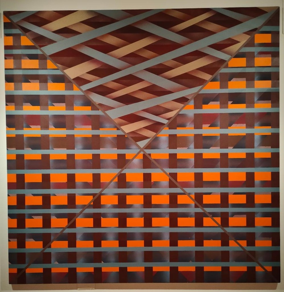 It is interesting to see examples of Scully’s earlier acrylic abstracts, with their layers and more elaborate grid-like compositions, the ‘Crossover’ paintings of the ’70s, that also bring to mind textiles in the way that the lines of colour are ‘woven’ onto the canvas. The dark ‘Fort’ painting, is a mesmerizing piece, for which Scully says the following: “I took the title from the design of a Roman fort, which is why I divided it into four. I was making four entities that would come together in a kind of sculptural whisper. The vibration between them would be exciting, if you let it work its magic. But of course it requires time.” In 1981, Scully mostly abandoned acrylics in favour of the depth that oils offer.