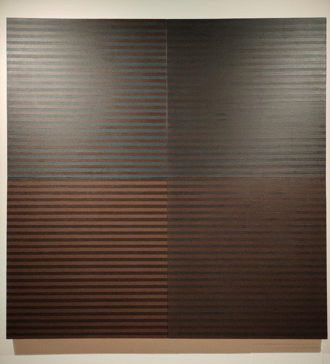 What is amazing about ‘Sean Scully: Passenger – A retrospective’, at the Benaki Pireos, is the shear size of most of the paintings. They are enormous! Skyscrapers of art! (Or nearly ceiling scrapers in this case). One imagines him up on scaffolding or ladders in order to paint the top sections. The big rectangular blocks of colour on many of the works, are as bold and strong, and reminiscent of, those Cyclopean walls in Mycenae. But does size matter? Well, it certainly adds impact, and presence, that’s for sure. Is this boldness bombastic? I think brave is a better way to characterize it.