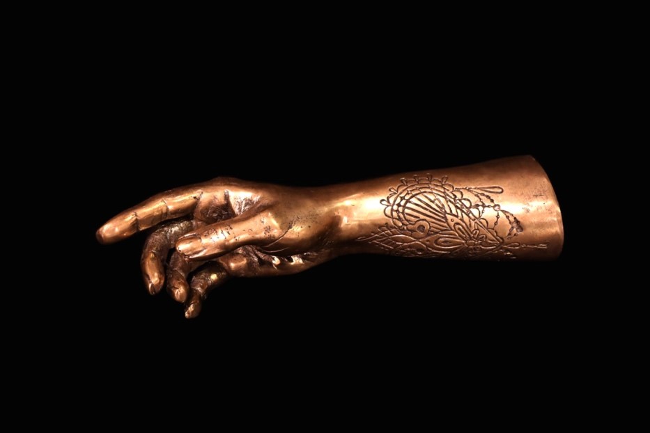 Marco Manzo’s sculptures bring to mind the ancient artefacts of Rome and Greece. They have been made from casts that have been taken from parts of the human body, and so, they are ‘fragments’ of the body, the same way that we see fragments of the body in archaeological findings. Let us also consider that many of these ancient artefacts which we see today as being mostly of pure white marble, were once not only adored, but also adorned (with colour). Traces of colour have allowed archaeologists to understand how they were originally decorated. With this in mind, Manzo’s adorned fragments of the human form, connect even further with the ancient forms of classical Greece and Rome.