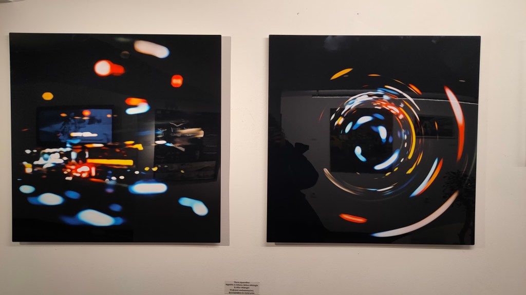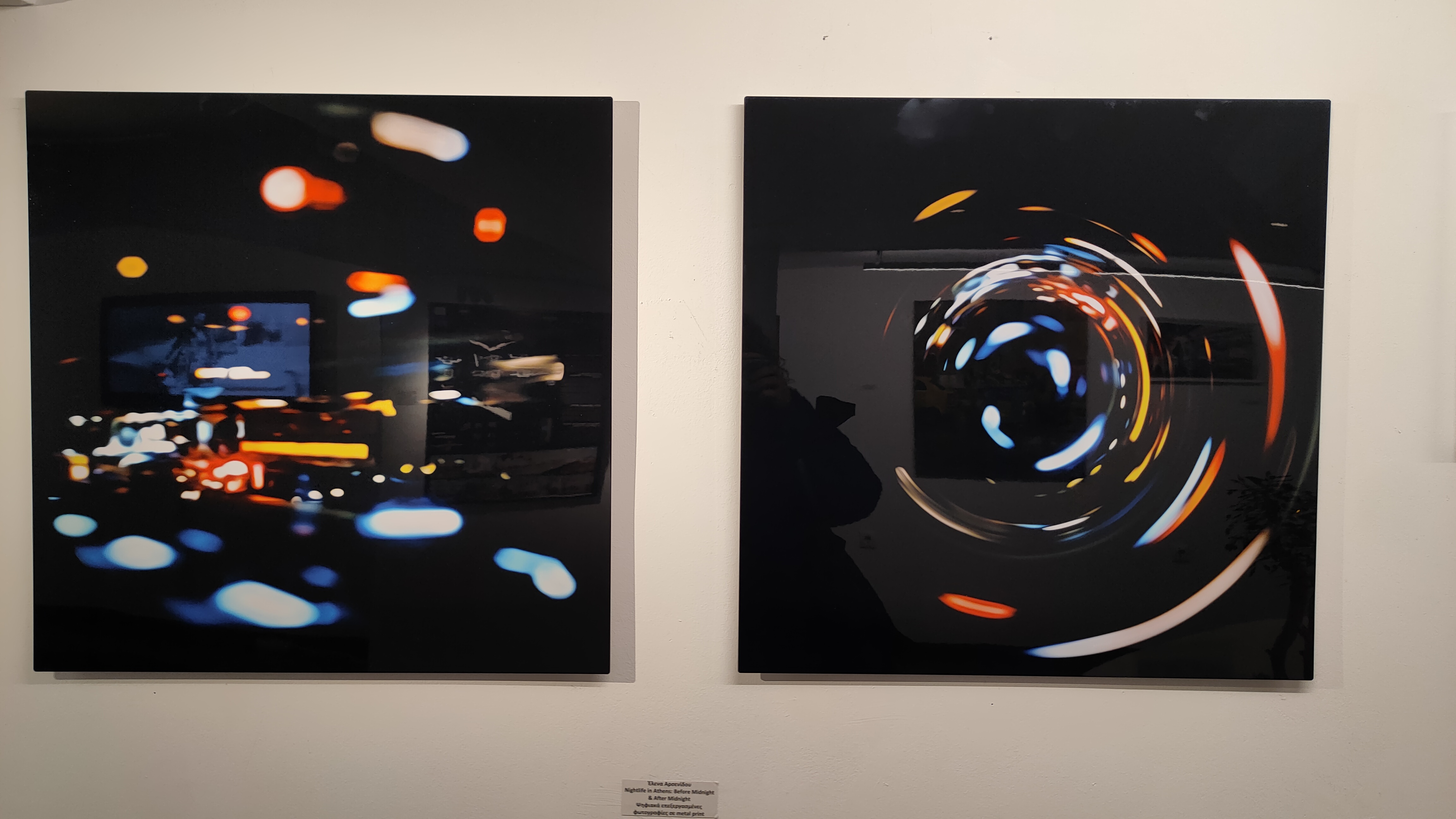 Elena Arsenidou, on the work ‘Nightlife in Athens: Before Midnight & After Midnight’:“I was born in Athens. I am a child of the center of Athens. As much as Athens irritated me in the mornings with the traffic and the unpleasant cement of the apartment buildings, it fascinated me so much in the evenings!!! When not everything was visible… When the lights were turned on… When the morning people had returned to their homes and the evening people were pouring into the center. That is why I chose to show this diptych, which comprises digitally processed photos on metal, that have been inspired by the night scene of Athens.”
