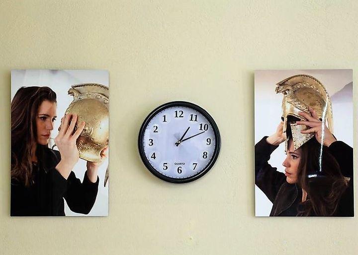 Angelos Skourtis: “Athens, a city that, upon hearing its name, immediately brings to mind antiquity… Today’s Athenians collide and confront their past. My triptych presents a young Athenian woman holding an ancient helmet in her hands… (Like Hamlet holding a skull). She is comparing herself with the past of this city. In the centre, there’s a clock which counts time backwards… Everything is yesterday… This city still lives and dreams about its old self… In the third part of this work, the young Athenian woman wears the helmet… She too wants to become a new Athena and to acquire a brilliant future.”