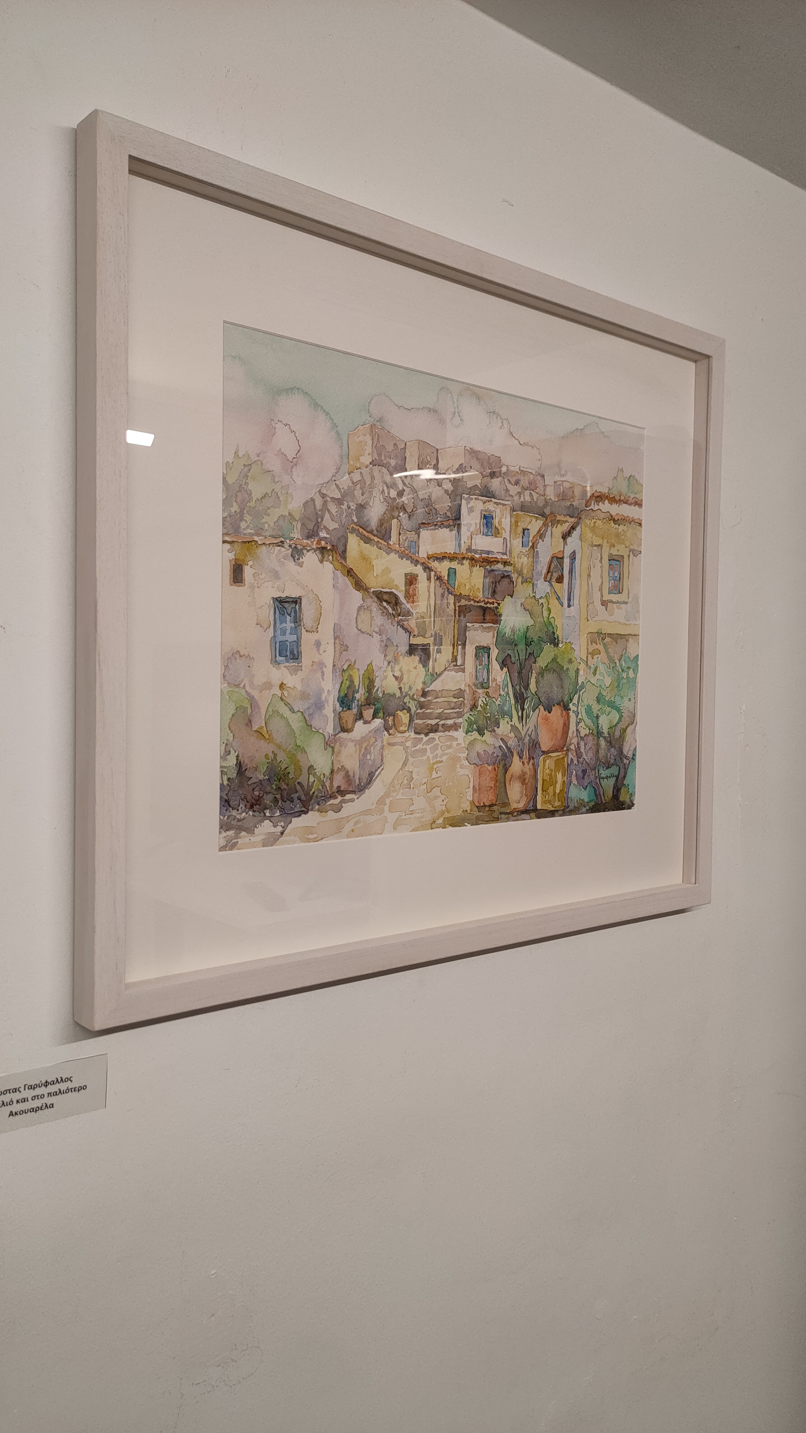 Kostas Garifallos on his work ‘From the Old to the Oldest’: “This watercolour is a window in time on a distressed city in which history has left its mark everywhere. Yellow permeates the work, as do forms which remind you of the Cyclades. Up high, the arrogant, timeless, global symbol of civilization and all of this bathed in that unique light which sculpts this Attican-Cycladic mass. That given light is the whole point of it all.”