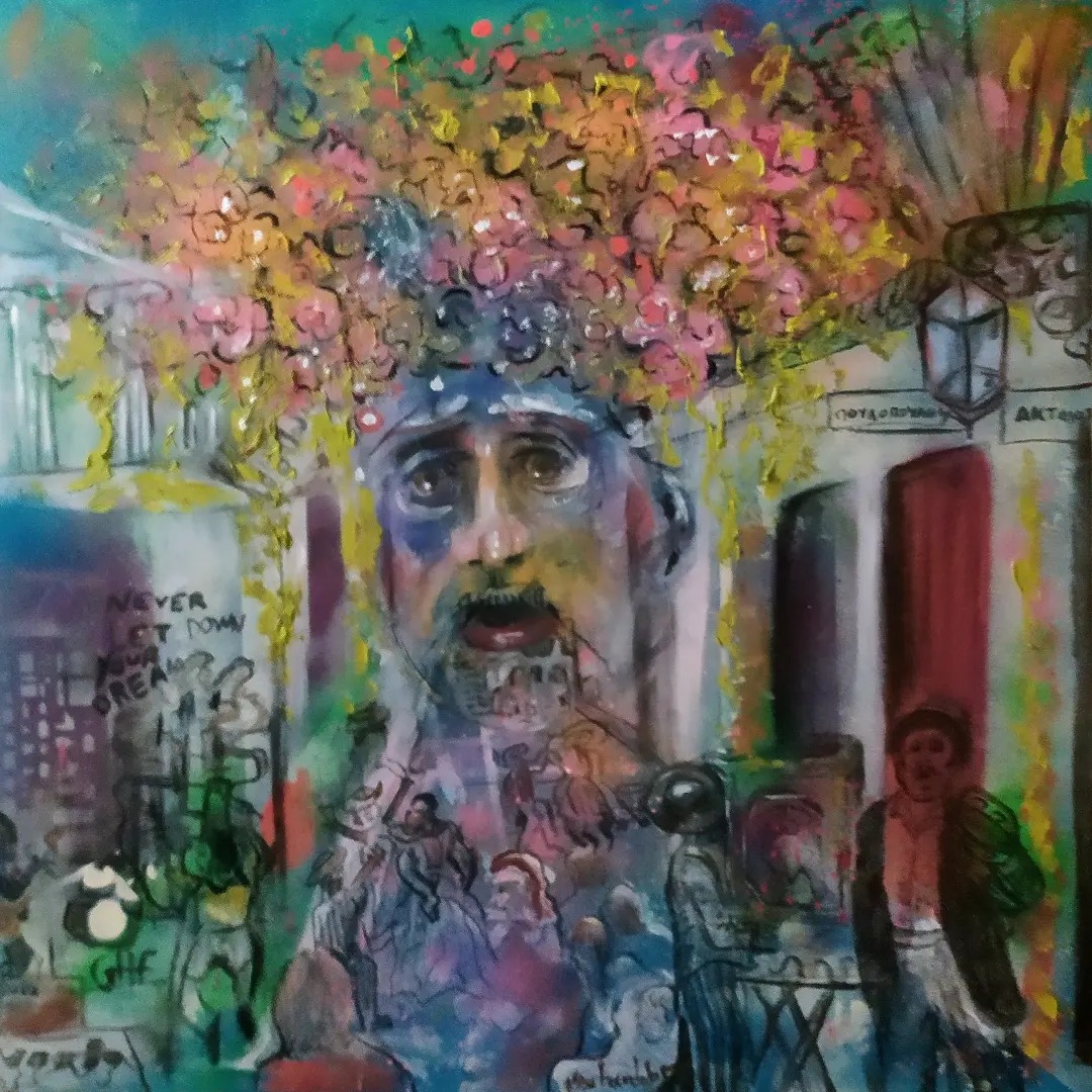 George Houndalas: “First of all this work is about a real location in Plaka, the corner of Poulopoulou and Aktaiou streets. This is where my grandma, my mother and her brothers were born. The work is also inspired by a Greek song or ‘cantada’, which tells us that God comes from Plaka. I have placed a God-like figure in the middle, but it could also be Dionysus or Bacchus. Epochs merge in this work, for example there’s a local street band from the ‘60s/’70s, but there’s also someone playing the ‘laterna’, and scenery from the ‘30s. The ‘30s and ‘40s were a particularly difficult yet also fruitful time in Athens: people were suffering from starvation but culturally speaking, things were happening in literature, music etc.”