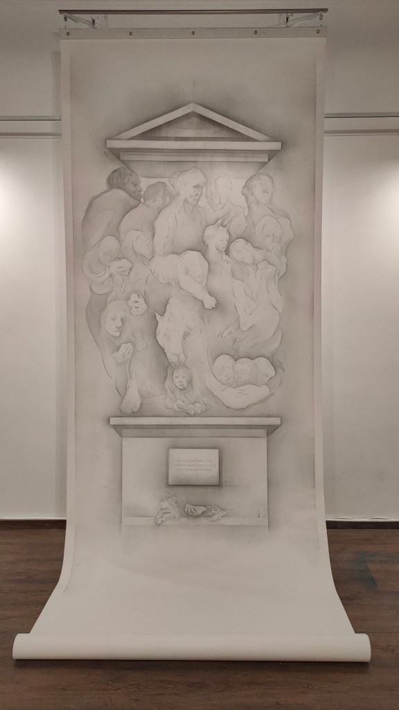 Nikos Kanoglou on ‘Memorial composition / Those that incarnate their destiny’: “On the way to their common destiny, lost in the hustle and bustle of the great urban centers they themselves build and inhabit, people try to protect the childlike selves they hide at their core, against the dangers, sufferings and tragedies of life, as they were once protected as beasts by their guardians. They build walls and shoulder imaginary armor, seeking to stand out from the surronding filth in the hope of escaping the altar, sometimes forgetting that at the end of this road, another tomb awaits them with certainty. Those, then, who embody their destiny, are ultimately ourselves, each of us taking on the stage of our own reality sometimes the leading role of the protector and sometimes that of the threatening scumbag, depending on the point of reference that each observer has.”
