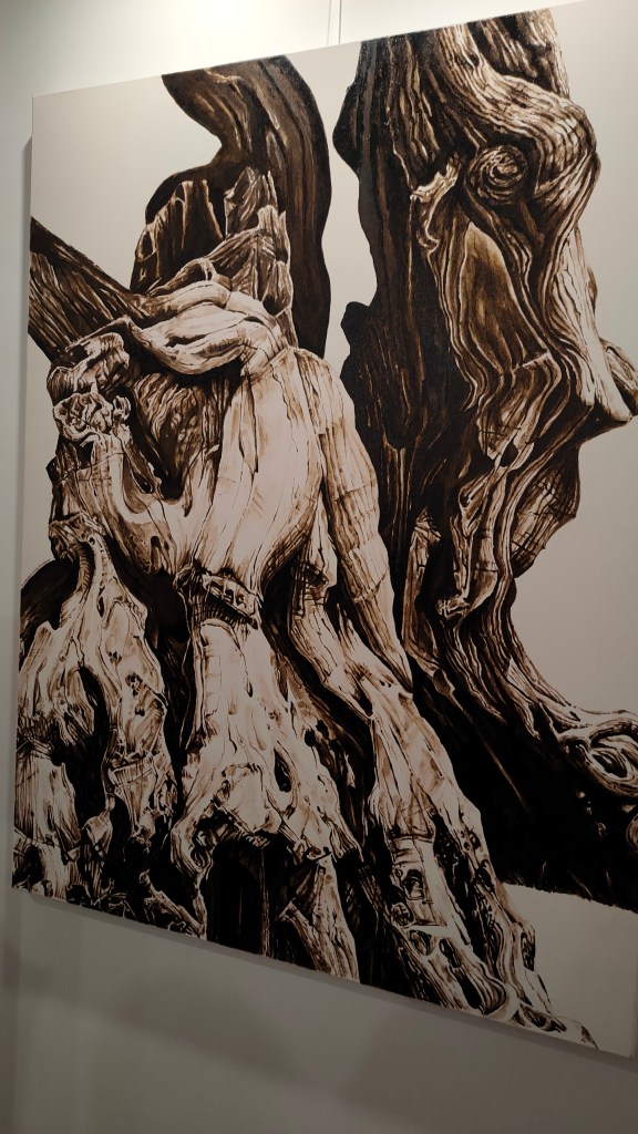 Christos Papadakis: “The work ‘Timelines’ belongs to a series on the theme of the olive tree (‘Elia’). A tree that thrived in Attica and was worshiped for its fruit. For this work, I used sepia ink on prepared fabric – a difficult technique due to the fluidity of the material. The sculpturesque qualities of the olive trunk inspire you to respectfully try to convey its soul.”