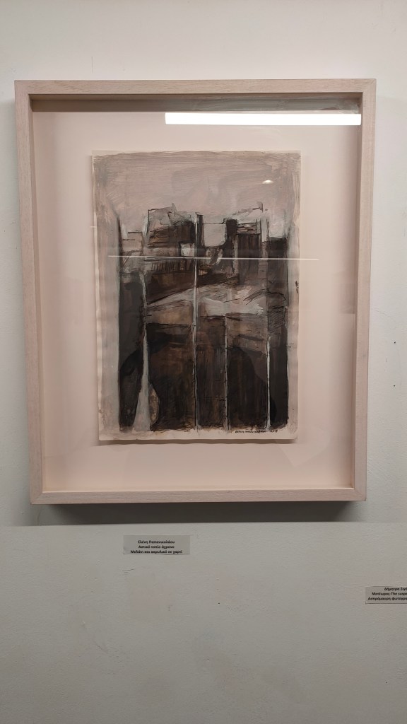 Eleni Papanikolaou on ‘Timeless urban landscape’: This work is a small-scale drawing with ink and acrylic painting, it depicts the roofs of buildings in the center of Athens and typically from Euripidou street, with the visual intervention of reflections – as mirrors – of the columns of the Parthenon. In this way I show the concept of timelessness, imbuing it with a melancholic, nostalgic feeling!!!….”