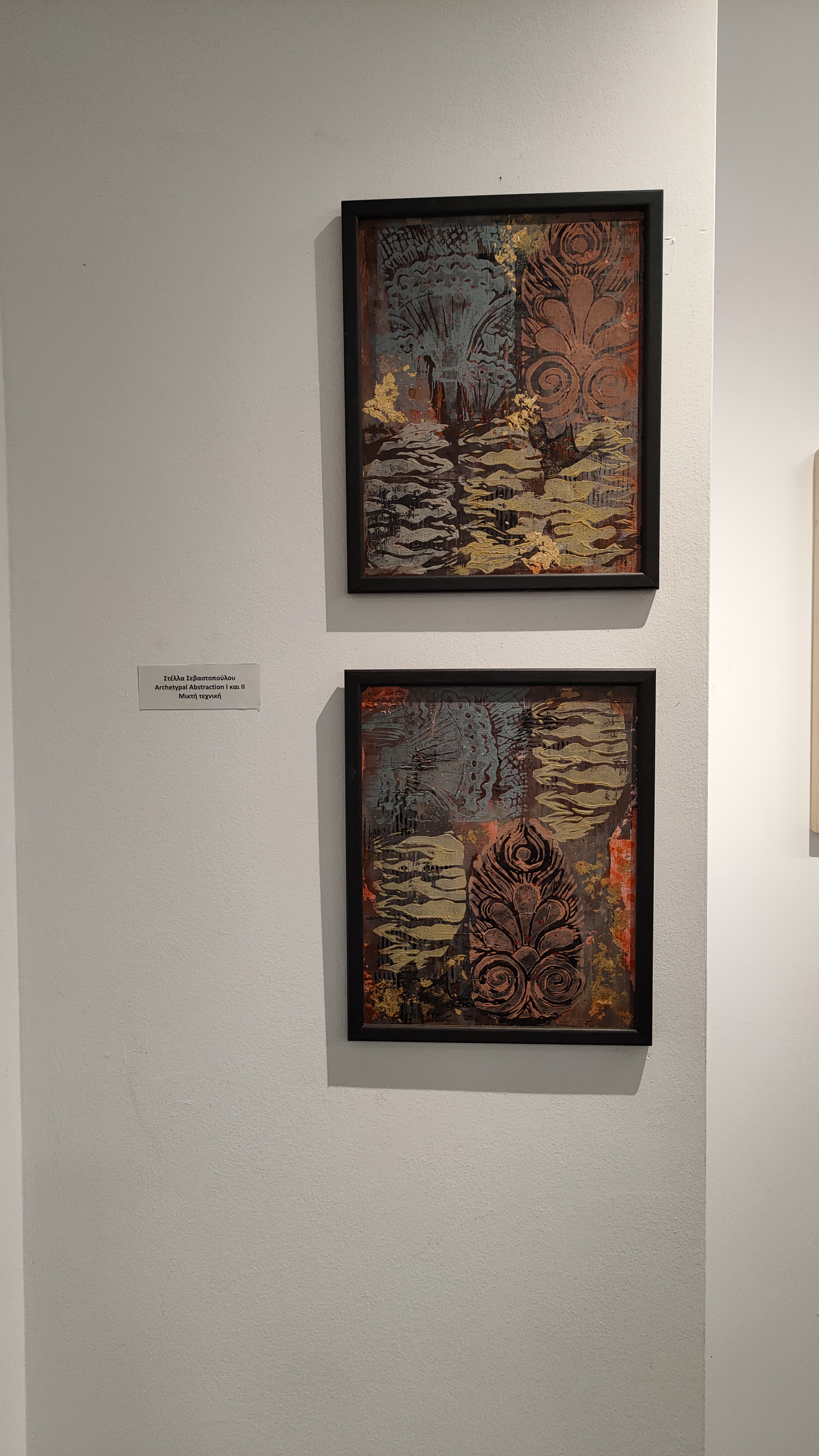 Stella Sevastopoulos: “These two works from the series ‘Archetypal Abstraction’, draw inspiration from the ancient design motifs inspired by nature that we find around Athens. From the leaves of the acanthus plant that decorate Corinthian columns, to other leaf and flower motifs found engraved on marble, molded out of clay, or even engraved on metal or gold. By incorporating forms inspired by these designs into my abstract painting process (which combines printing and painting techniques) I explore their significance in our day and age. On the one hand these forms symbolise remnants of the past, now faded and imperfect, yet on the other hand, their new abstract compositional environment gives them the opportunity to be re-examined. New associations and meanings are thus created (e.g. connections with other cultures, or with primal symbols from the collective unconscious).”
