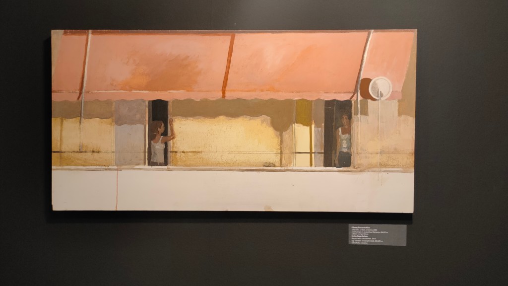 With paintings, sculptures, installations, photographs, maquettes and archival material, this exhibition has been expertly curated by Nikos Vatopoulos and Iris Kritikou, and comprises the works of 63 artists, spread out in the two exhibition halls of the Hellenic-American Union. A wide range of materials, techniques and approaches are used by the artists: From Alekos Fassianos’s angel builder perched on top of an apartment block, to George Rorris’s raw, realistic rendition of an apartment room with life model, from Io Angeli’s ‘Lockdown’ sketches in the apartment, to Kostas Papanikolaou’s beautiful balcony scene in egg tempera, where shady ladies hide under a bright orange balcony tent.