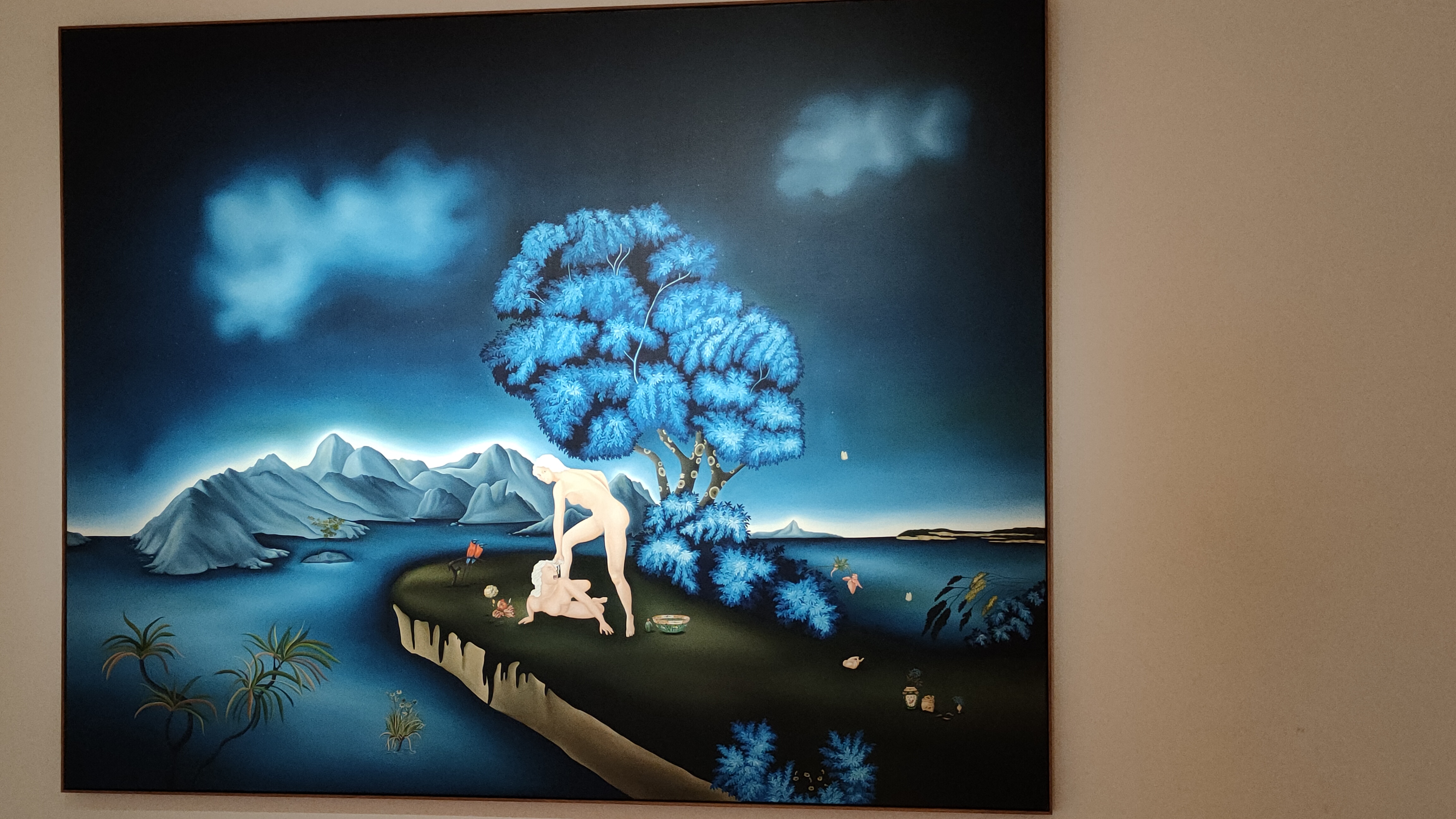 The exhibition at EMΣT, the artist’s first major museum presentation, features a series of paintings with compositions of human figures standing alone or interacting in natural landscapes. The starting point for these works is desire: Bagaki’s dreamy paintings are produced, as she emphasizes, by and for desire. Intimations of physical attraction and erotic observation shape the artist’s relationship with the depicted bodies and their environment. The exhibition Something like a poem, a nude, and flowers in a vase unfolds as a kind of dreamlike wandering and observation on desire, sexuality, and erotic quest.