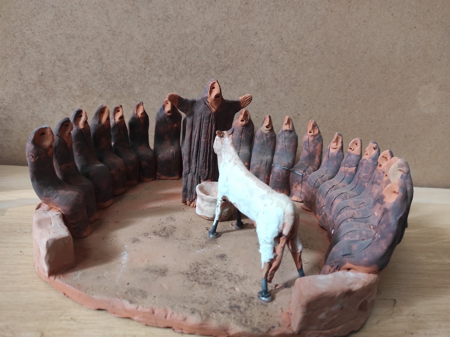 Insisting on this minimalistic form, Papagianis managed to compose a kind of sculptural performance, a form of ceramic ‘puppet show’. By grouping together hundreds of sculptures, he creates progressions, exits, litanies, parades, presented in a very imaginative and deeply evocative way. Reaching a point where the small becomes great. ‘Performances’ presented with great success in a number of important museums, an artistic intervention honoring the 200 years of our National Liberation, as well as the constant drama of our national history. Because the drama of nature or time is a projection of the drama of existence. When the senses take the form of aesthetics and nature takes the form of metaphysics.