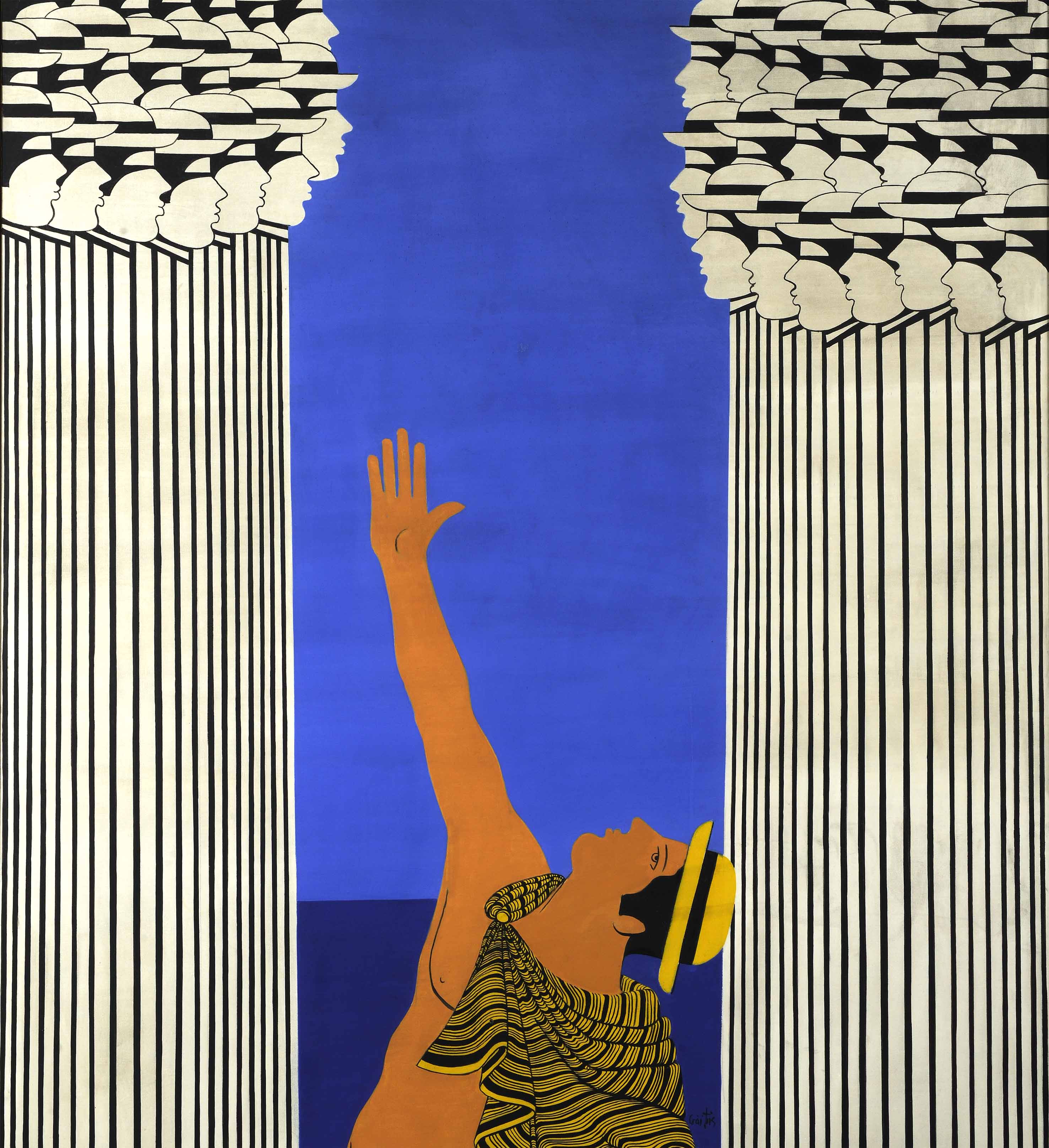 Included in this exhibition are many of his top works: ‘Sirens-Odysseus’ (oil on canvas, 150 x 195.5 cm., Collection of the National Gallery), ‘Oh! Gods’ or ‘The Companions’ (oil on canvas, 195 x 150 cm, Collection of the European Cultural Center of Delphi), ‘Delos’,( oil on canvas, 195 x 150 cm, Collection of the Antonios E. Komnenos Foundation), ‘Parade’ (mixed media, 150 x 150 cm ., Piraeus Bank Collection), ‘In the Court of Miracles’ (oil on canvas, 130 x 97 cm, Alpha Bank Art Collection), ‘Motorcyclist’ (c. 1967, oil on canvas, 132 x 99 cm, National Bank Collection), ‘Little People on Wheels’ (wooden construction and mixed media, 227 x 74 x 72 cm., Collection of the Museum of Modern Greek Art of the Municipality of Rhodes), ‘Exhibition and street spectators’ (oil on canvas, 200 x 200 cm., Collection of the Vorres Museum).