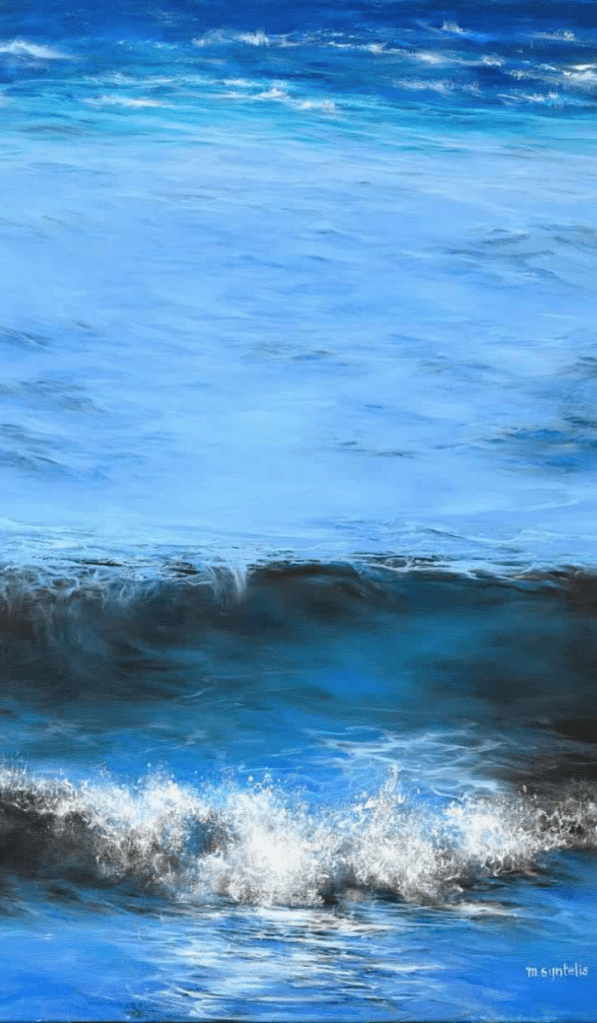 After painting Santorini and island landscapes “as time progressed, Marina lost interest in those rooftops, and became all the more focused on what was beyond them – the sea with all its myriads of shades, light effects and rhythms. The seemingly structureless fluidity of the water became a challenge for her, to capture it and give it form and structure, to find its inner workings. Ripples and light effects danced on her canvases like mystical beings. But it was the drama of the wave, which also enticed her. The way it crashed into millions of pieces, and how she could make sense of it visually, formally, philosophically, empathetically.