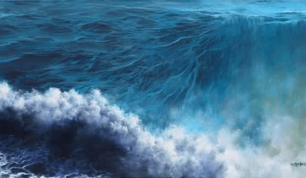 Marina Syntelis’s analysis of wave structure became all the more in depth and detailed with every new painting […] where the crashing waters create misty, ethereal and elusive atmospheres. […] A Dutch fellow artist, introduced an age-old secret to her, used by the old masters to create luster, transparencies, and glowing colours in their works. There, in the depths of time, she discovered the use of pine resin, mixed with turps and linseed oil, known as a form of ‘megilp’. This medium, was used together with oils by many masters. It was a secret ingredient used by Turner, Rembrandt, Van Eyck, Rubens, in order to create fabulous glazes and dates back to the mid-15th century. […] Marina resurrected this technique (a laborious one which involves creating different ‘strengths’ of this medium, with different percentages of linseed oil/resin/turps), by placing it within a contemporary context. […] There is a power and a dynamism in Marina Syntelis’s work that harks back to Romanticism, and its awe-inspired perspective on nature, coupled with a classical search for structure and form (how can there not be? She’s Greek after all). But, there’s a contemporary feel to her painting: Is it because of the way she combines hyper realistic obsession with detail with an ethereal abstraction? Maybe in part. […]”