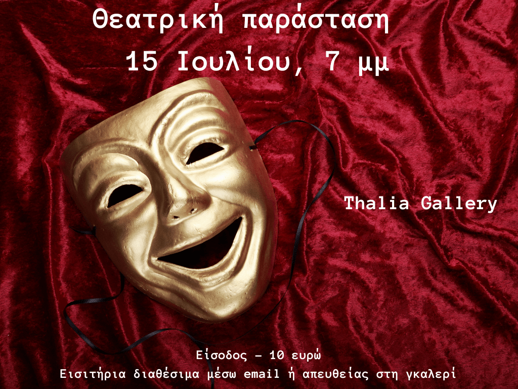 - The theatrical performance will take place on Saturday, July 15, 7pm. Tickets are available at the gallery or by email at thalia.artspace@gmail.com. Admission is 10 euros for adults and 7 euros for children.