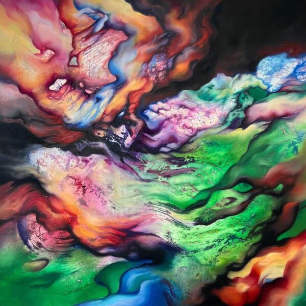 Fahimi’s work speaks of movement, flowing rhythms and the ethereal nature of being. It echoes the essence of the fast-paced world we live in, where change is inevitable, where cultures collide and fuse, creating new realities in the process. Colour plays a key role, adding magic and mystery to her artistic worlds, which are primarily abstract, but in which the viewer is invited to discover forms and figures, adding their own associations and memories to the work. The viewer’s input in abstract art is after all, one of its beauties: its fluid nature can speak differently to each person who confronts it. However that ‘grey zone’ between abstraction and figuration is also an intriguing place in which to be, for an artist, and can add a psychological perspective to the creative process, which in this case allows Fahimi to explore both her roots and her new surroundings.