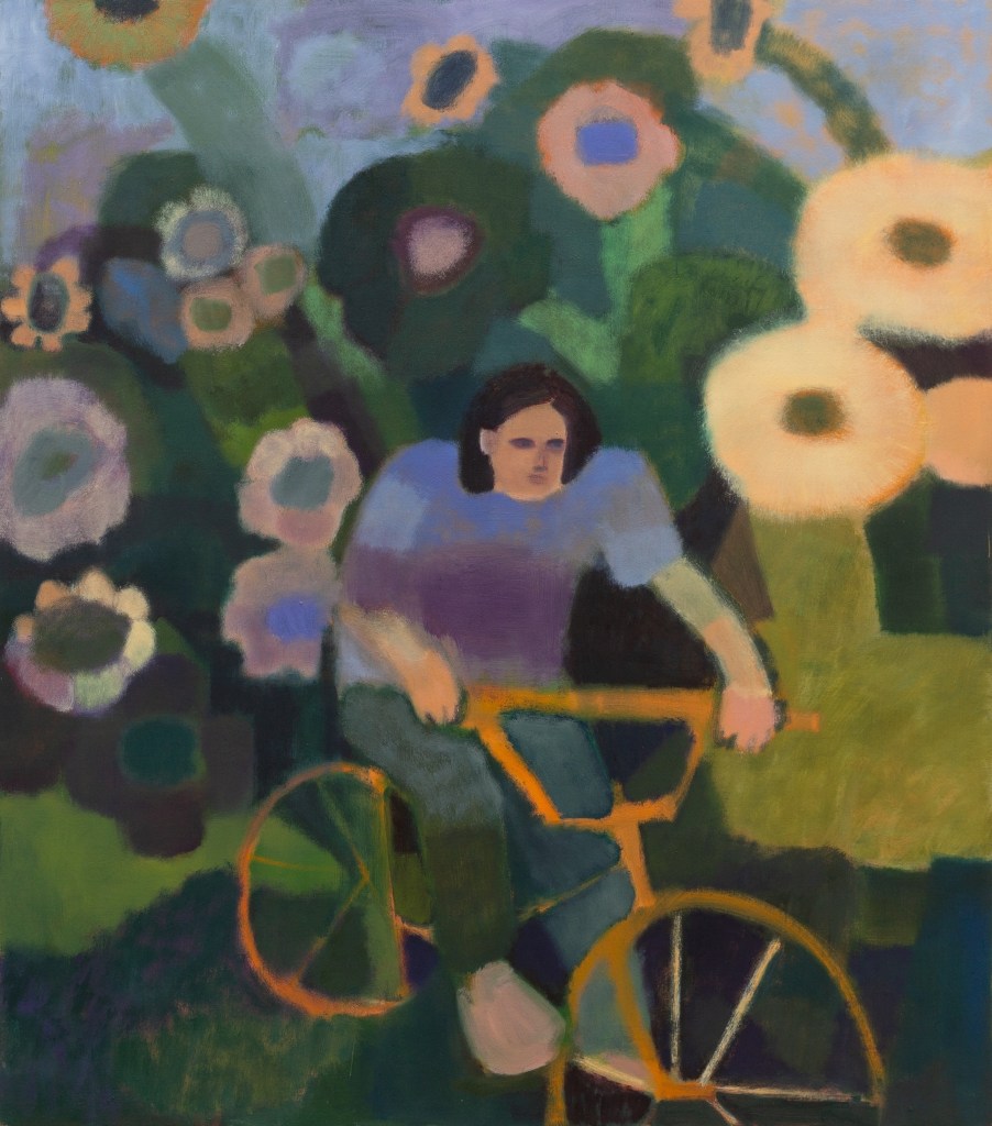 Limniou creates images, referencing nostalgically a past era. Through exploring a history of painting, she is constantly searching for ways to redefine and unfold her craft in contemporary times. Scenes of everyday communal activities, either from laborious or celebratory rituals or even ordinary habits are consistently depicted in her oeuvre. Her characters playfully interact with the viewers, looking at us beyond the borders of the paintings, often breaking the boundaries of the canvas, and searching for ways to reveal themselves. Limniou is a storyteller. Every work reflects on a story, a scene that takes place, a character or more engaging in actions. Human presence, even in the absence of figures, is always there, serving as evidence of the overlapping experience of humans and nature. Often what may be considered mundane everyday activities come to the forefront. People working in the fields, picking apples, a couple kissing, a person riding a bicycle, a gardener tending to their plants. A sense of care is present both in the ways the painter constructs her works and in the ways that the scenes are unfolding.