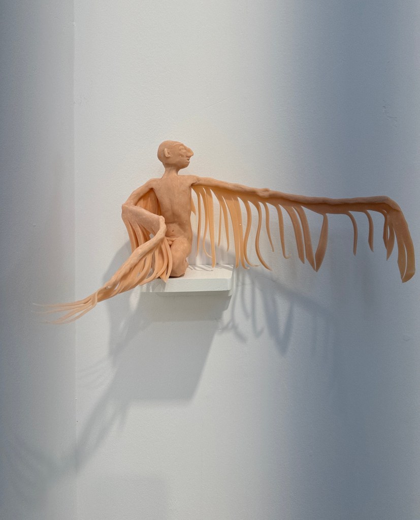 My solo exhibition at Spazio b5 in Bologna this year featured sculpture, photography, video-installations and crayon drawings. In Athens I showed paintings and small figurines and for the performance that took place at Art Athina, the actors used my masks and clouds as props. I don’t think I am in a process of leaning more towards painting, but for the aim of this exhibition 2D suited me well. I worked mainly through my sketchbook towards the development of a new visual language; a shift from Northern towards Mediterranean European context in my work.
