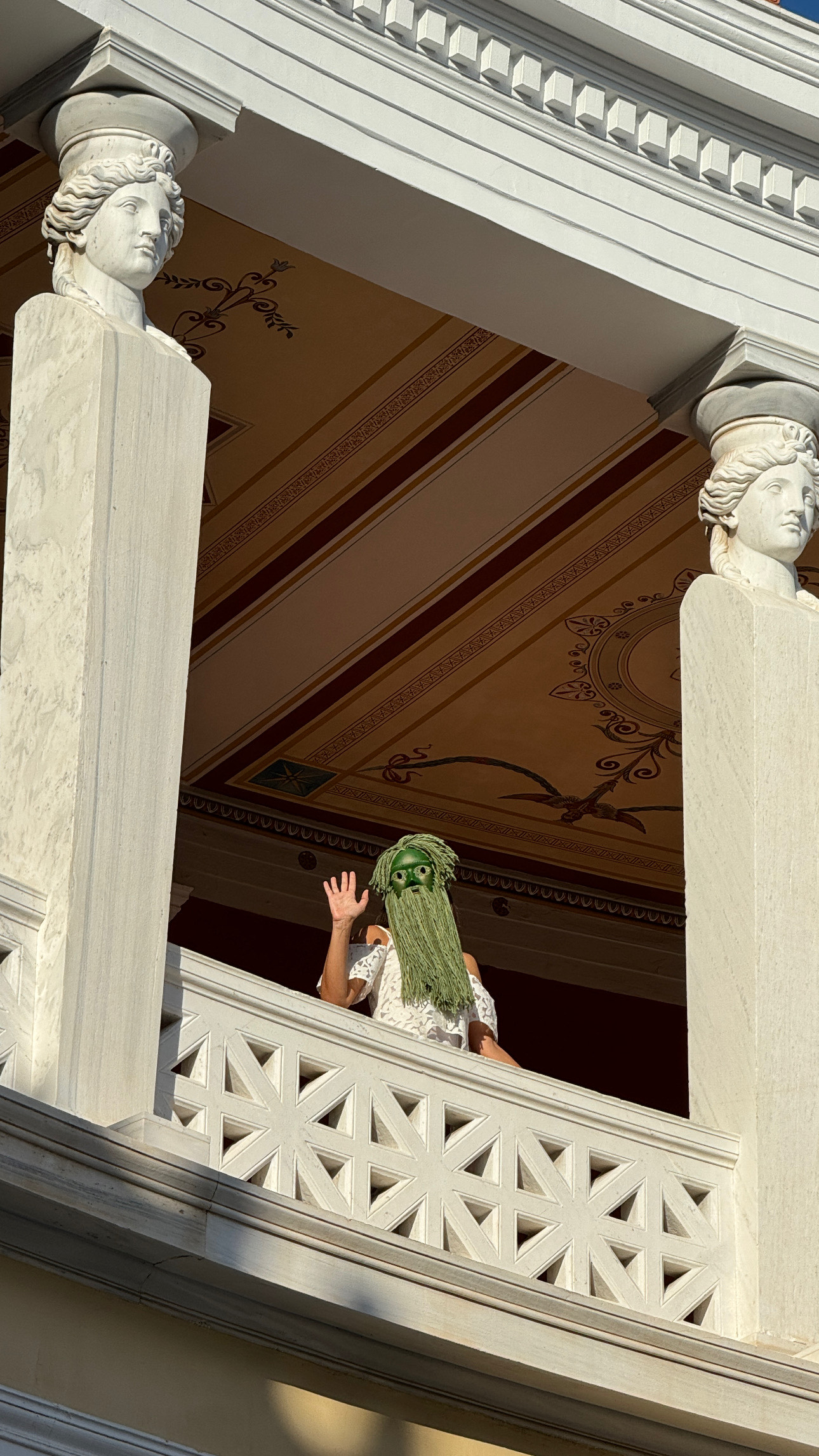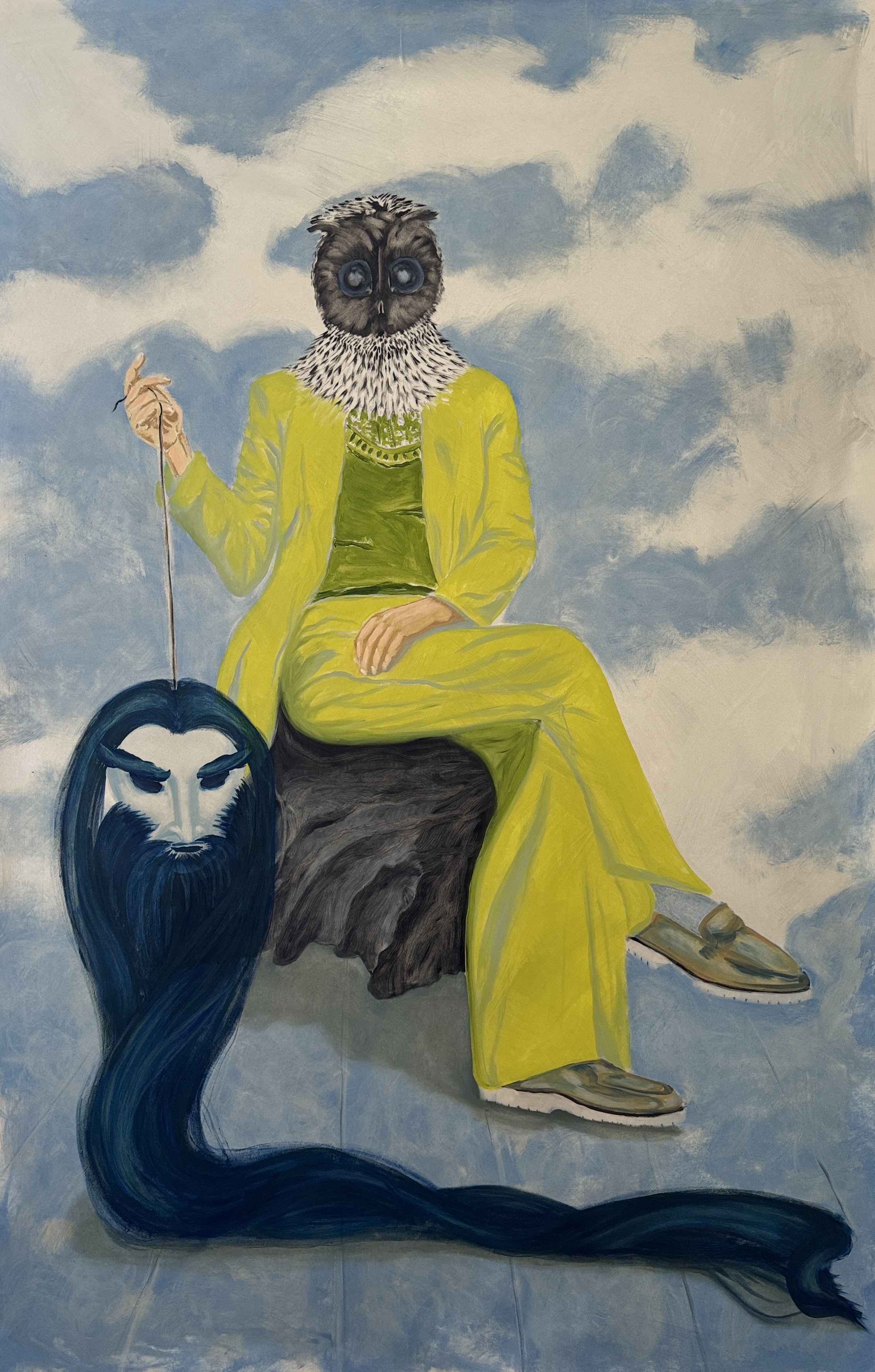 The series of paintings we showed at the fair is called Passage to Zappeion. They were painted with Art Athina and an impending move of my family’s seat to Greece in mind. The paintings are a visual logbook of my creative journey exploring new connections and fresh sources of inspiration in Greece. I chose the owl of goddess Athena as my guide to examine my position as an artist in this new cultural space, whilst bidding farewell to the ‘bearded man’, who was a trope in my previous work and often appeared as a masked figure.