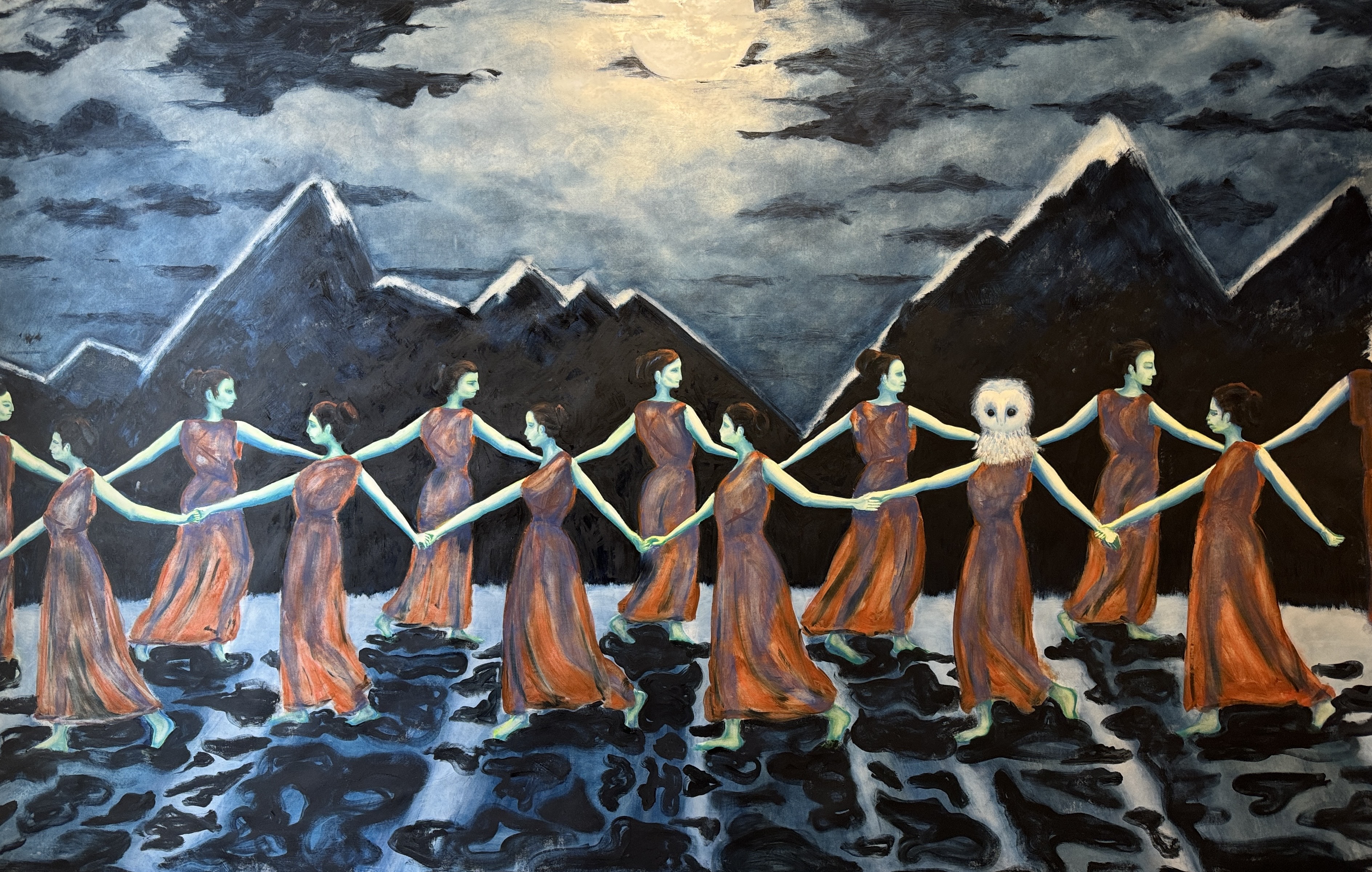 The painting Dance loosely incorporates elements of folklore dance on the village square, witches dancing by night and the chorus in Greek plays. The power of women and the collective and the concept of circular events, ever returning.