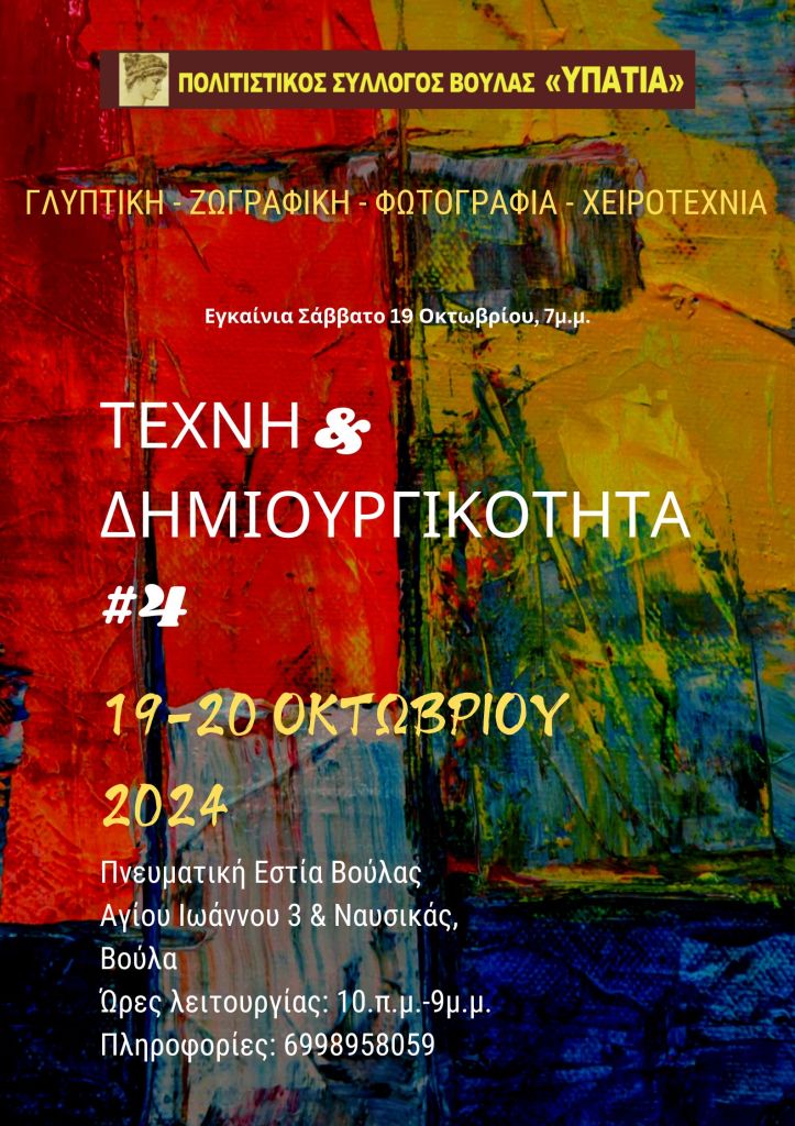 In addition to the earlier art exhibitions organized by the Cultural Association of Voula “Hypatia” (President Ifigenia Amorgianou), at other venues, the association’s autumn exhibition “Art and Creativity” has become an institution of the southern suburbs, a creative dialogue between the many art forms created in the region, but not only in it.