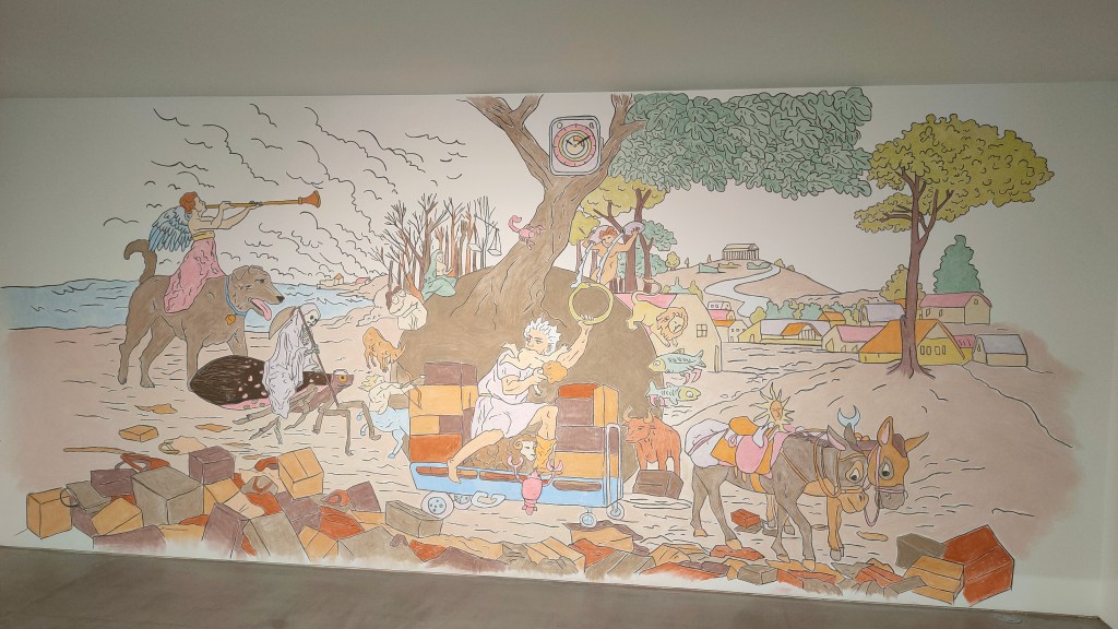 A large wall mural executed with pastels, presents how Yago can take on the role of an allegorist, setting some of the most charged and twisted visual icons of late capitalist life and the imminent climate crisis into a riot of symbolism. Adapting Pieter Bruegel’s 16th century allegorical etching The Triumph of Time, Yago’s mural The Pageant infuses the Renaissance scene with contemporary creatures navigating the hellscape of our present polycrisis.