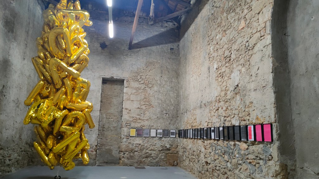 Certainly the most eye-catching of works by Banu Cennetoglu at Sylvia Kouvali, is the enormous, gold bouquet of helium-filled balloons that nearly touches the building’s timbers. It comprises all the letters that compose the 20th article of the Universal Declaration of Human Rights as proclaimed by the United Nations in 1948. The concept behind this work is that as the exhibition duration passes, the promise of the article will gradually deflate to touch the ground, finding its final form after the show closes. However, the work’s helium-filled balloons are still holding strong for the time being, with only a few balloons having deflated so far.
