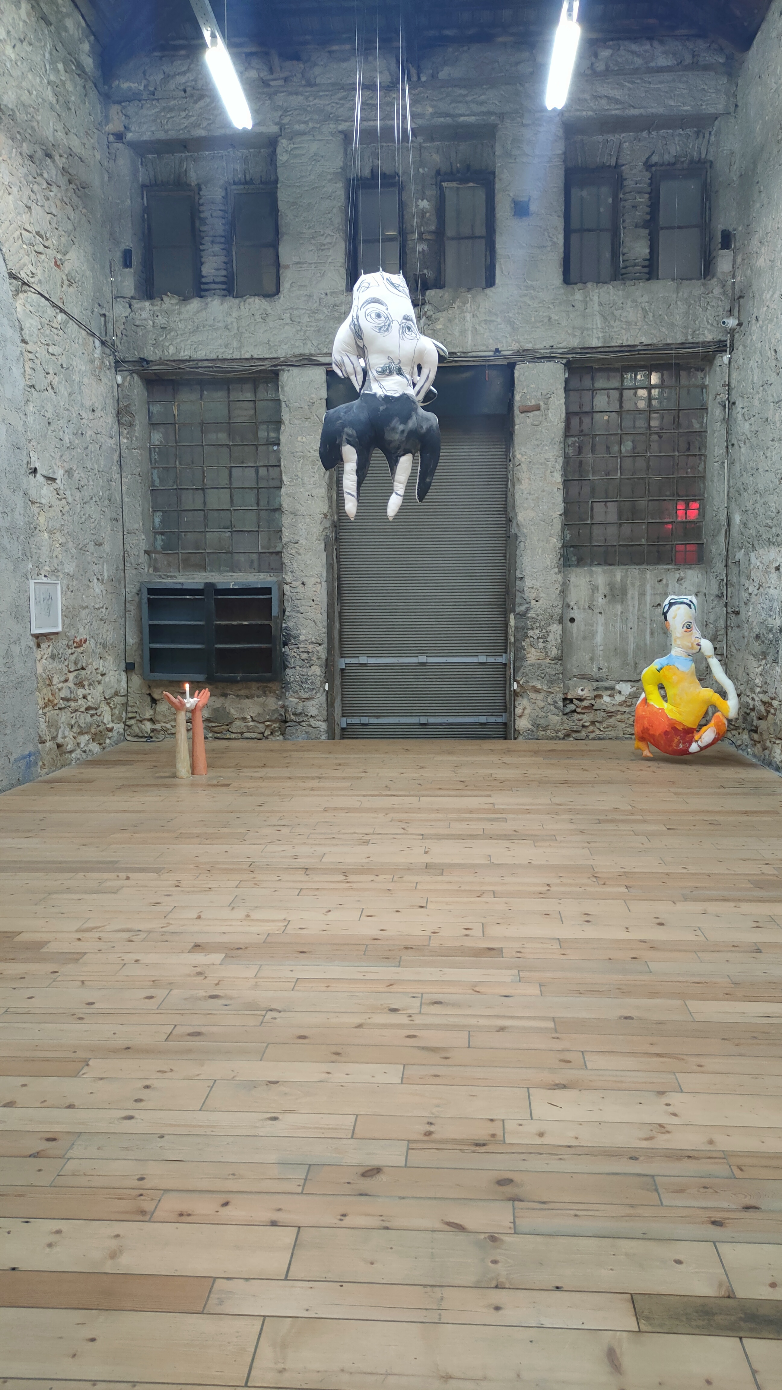 Sylvia Kouvali first created Rodeo gallery in Constantinople, in 2007. The gallery moved to London and then to Piraeus, and in 2024 was renamed Sylvia Kouvali. Housed in an impressive old warehouse, which dates back to 1900, this atmospheric gallery or “production house” has presented some cutting-edge exhibitions. The exhibition Observations on Somethings Forgotten, with works by Anna Boghiguian presents works around the life and work of Constantine P. Cavafy. Boghiguian had visited the house in which Cavafy lived in Alexandria, and painted various scenes there, which are on view at the gallery. In another room, Cavafy watches from above, in the guise of a stuffed fabric doll. In one corner of the room, you can also find him if you peek into a box wrapped in drapes. In both rooms, candles have been lit in shells, cradled in hands made of bronze. The works have been inspired by Cavafy’s poem ‘Candles’. The artist utilizes fabric to create other works, and some of her paintings are also included.