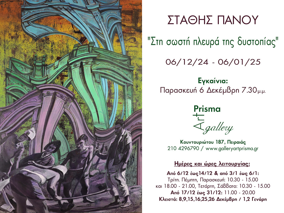 Meanwhile, in the centre of Piraeus, close to the main shopping streets, is gallery Art Prisma, where Kosmas Panoridis exhibited recently, bringing to the space a whole host of art and artefacts inspired by his work in stage design and costume. Sequins, lace, embroideries and velvet are among the materials that he uses to create elaborate designs and scenes, but also clothes with artistic flare. These days, Stathis Panou is exhibiting his work there in an exhibition entitled The Right Side of Dystopia (runs till Jan 6).