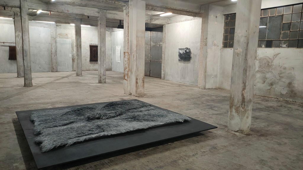 Upon entering the upper storey of this space, you will come across the work of Hermione Syrogianopoulou, who has developed an artistic practice which explores the processes of weaving and rug-making, via the use of metal wires and threads. Her metal furs, textiles, and flokati-style rugs take over the space and create an interesting dialogue with its post-industrial character.