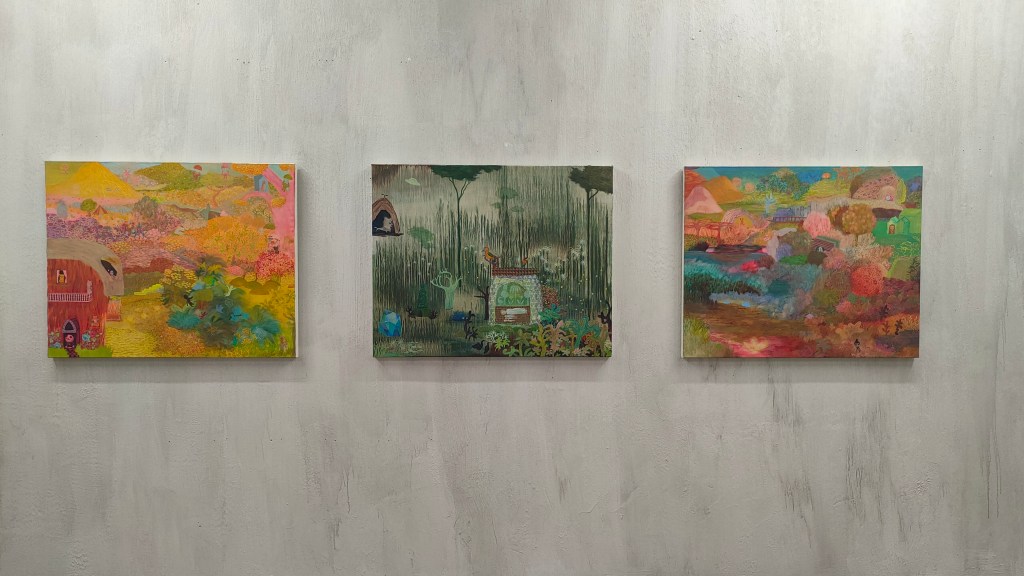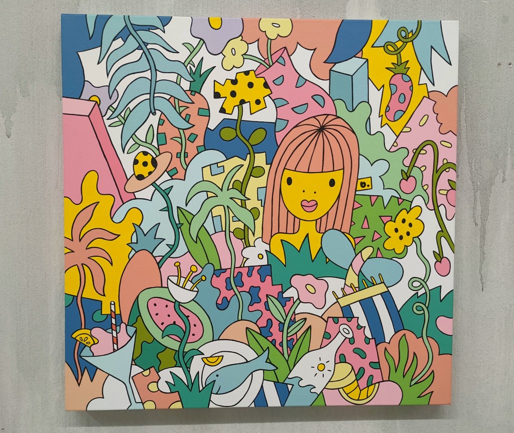 Further down in the next hall, are the works of Jackie Berridge. Her exhibition Flights of Fancy presents paintings which are a mash of inspiration from childhood memories, dreams, and traditional stories. She creates fantastical landscapes populated with beings and anthropomorphic creatures, telling tales of joy and sadness mixed with shades of darkness. Next to Berridge’s works, in an adjoining room, are the works of an artist known simply as b. The exhibition Water Memories by b., present the artist’s canvases inspired by memories of playing with water in the garden. Happiness, pastel colours, stylized forms and pop art influences are fused into the creative processes of this artist.
