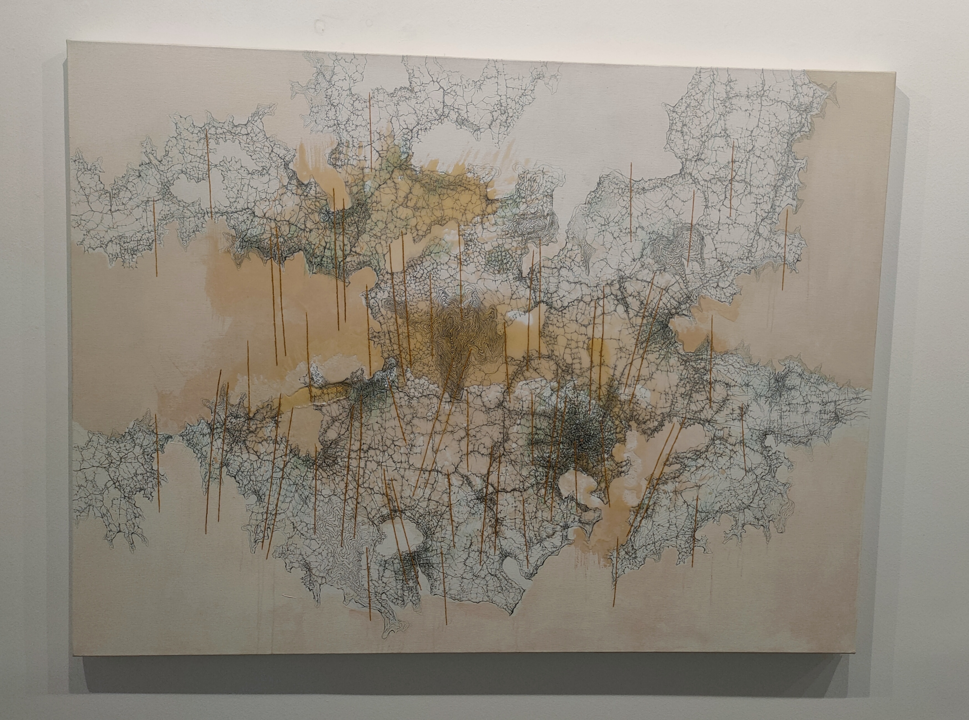 The first works you encounter upon entering this space these days, are those of Yiannis Christakos. His solo exhibition is entitled In the Crack of the Space, curated by Bia Papadopoulou. Large canvases that explore the contours of maps, to which threads and other materials such as resin have been added, set the scene which conjures up associations of travelling, both esoteric and worldly. The delicate lines of these works weave a tapestry of thought-processes that mesh history, memory and geography.