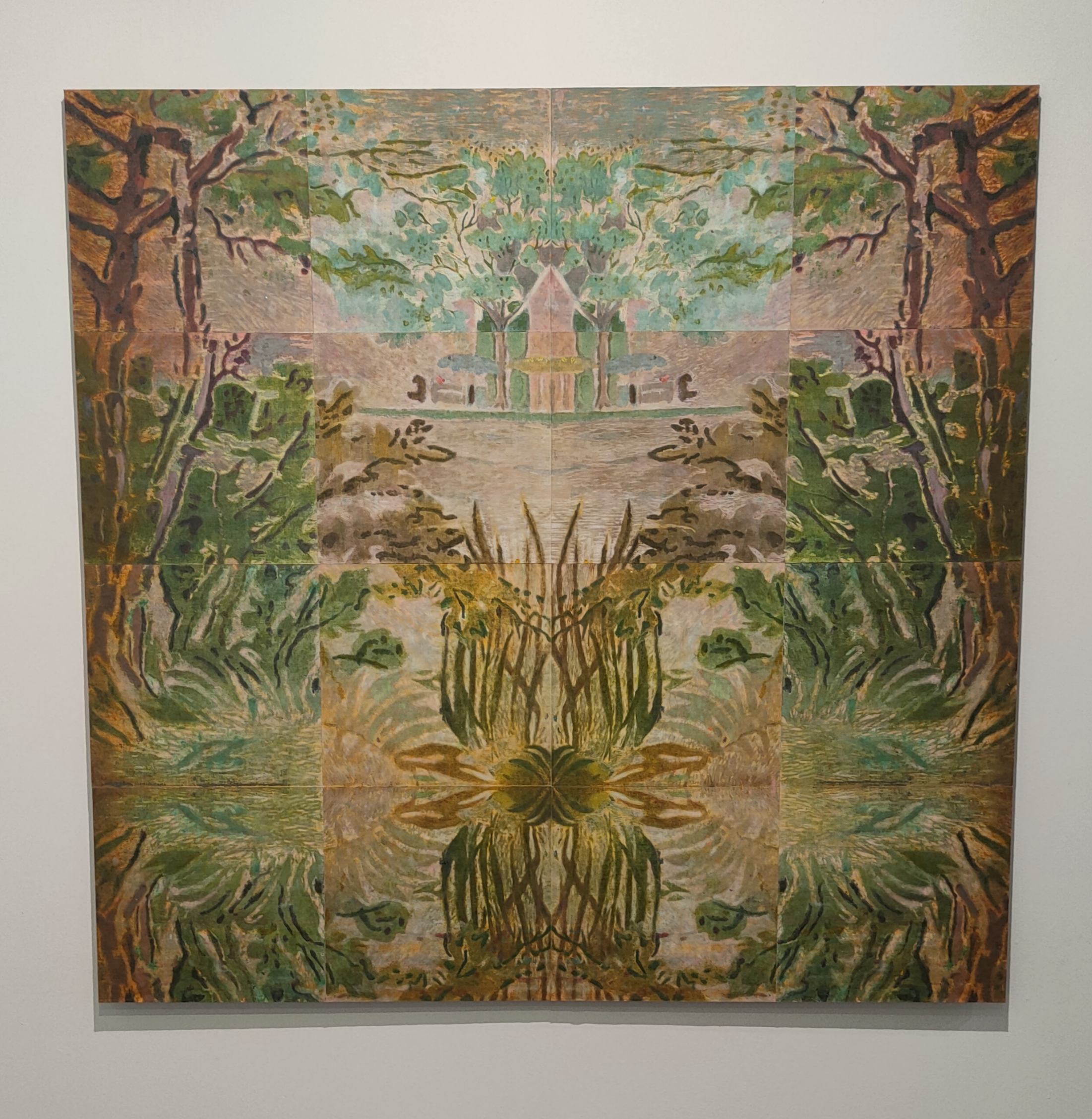 The works of Bella Easton occupy a large hall in this art space. Her exhibition Everything Flows, is inspired by the words of Heracleitus (“All things come into being by conflict and opposites”), and T.S. Eliot (“At the still point of the turning world. Neither flesh nor fleshless; neither from nor towards; at the still point, there the dance is”). Easton’s internal landscapes are created through an intimate ad very personal journey that seeks a place of safety, creating her own history in a time where our world has become increasingly turbulent. These works seem to be inspired by antique tapestries, ornate wallpaper and tile designs, where mirrored images of flower motifs and decorative designs are integrated into large compositions, evoking a dreamlike calmness and serenity via their myriads of forms.