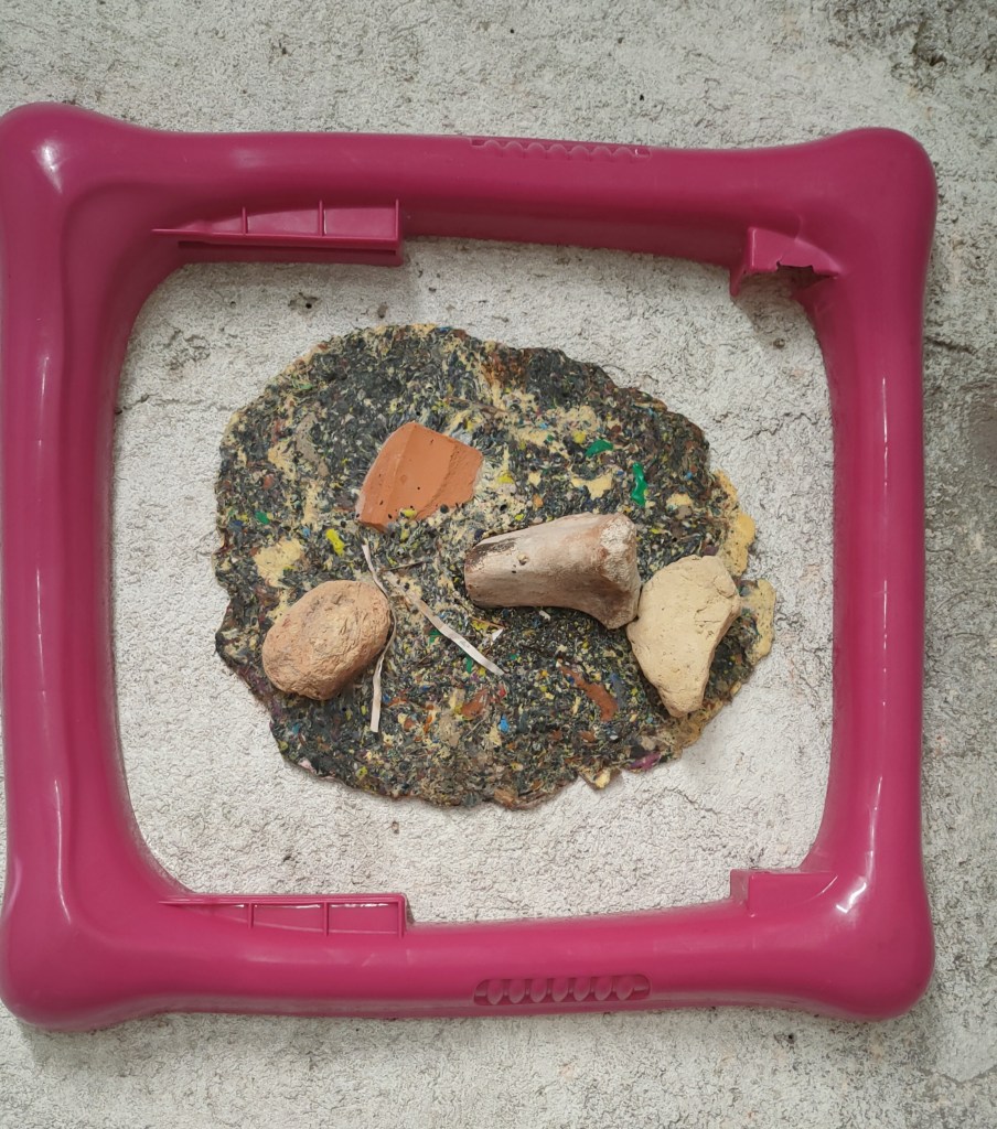 Also on the upper floor, are the works of Guillaume Krick, in the exhibition Oil Paintings Revisited. Krick recycles plastic found on the beach, melts it together to create abstract collages in a way that recalls early modern art. By reusing plastic toy components, he creates frames around the collages, which  hark back in a tongue-in-cheek manner to the frames of the  most prestigious museums.