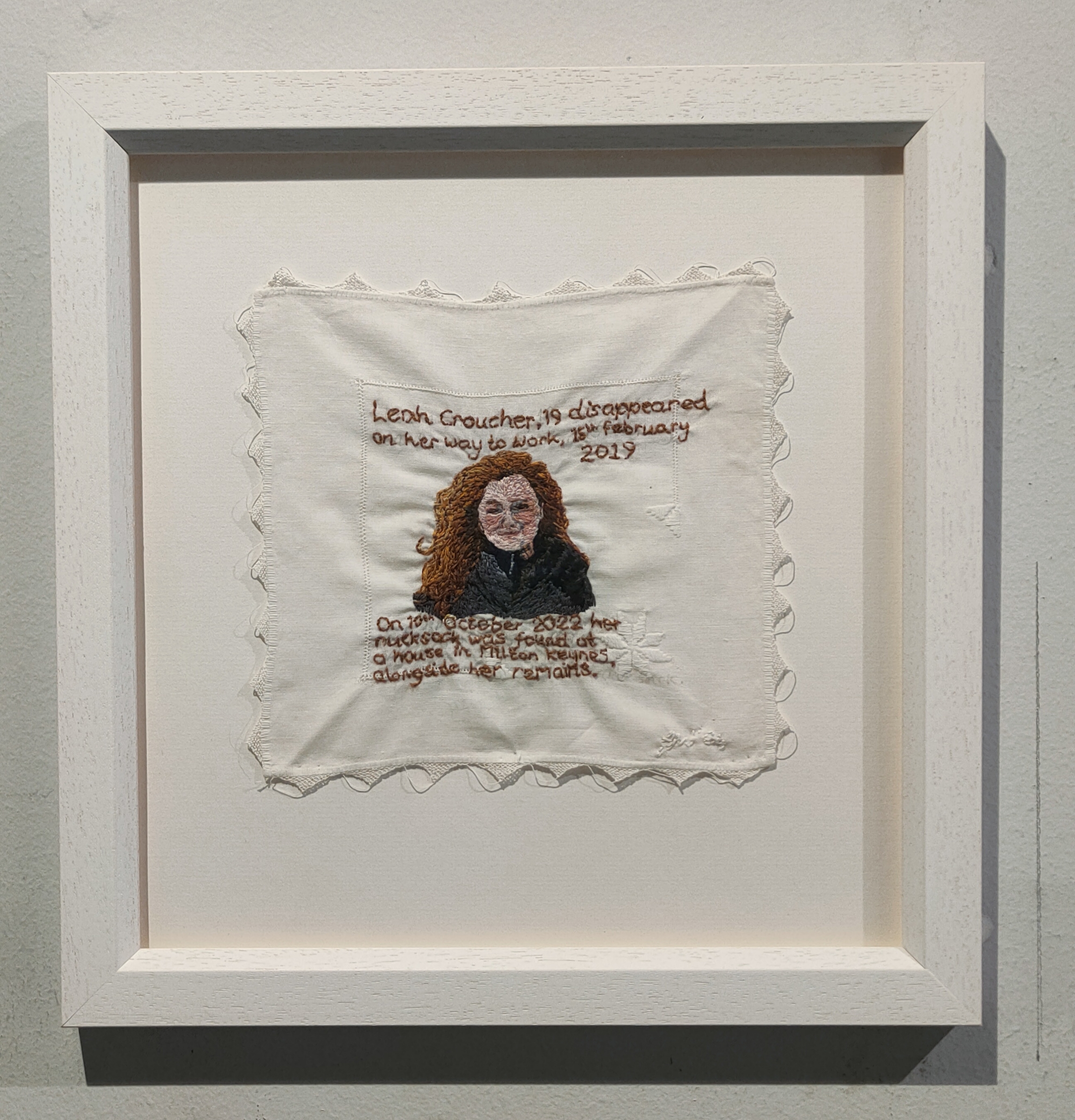 In another space, you come across the work of Alison Whitmore, whose exhibition Killed Women comprises delicate handkerchiefs embellished with lace, upon which the artist has embroidered the portraits of women that were victims of femicide – cases of domestic violence, victims of date apps, of family members etc. The exhibition’s material states that an average of 120 women every year are killed by men in the UK. Handkerchiefs are often associated with grief, and with this delicate issue that the artist has focused on in this series of works, she hopes to bring awareness to this grave issue.