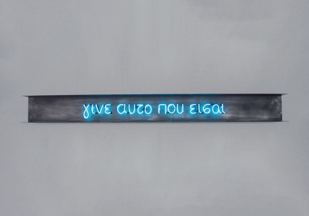 There are many sides to Panayotidis’ work, which keeps evolving. Indicatively, in the ‘80s he experimented with an archaically realistic collage technique, using materials such as crumpled wrapping paper, aluminum foil and tar; it is the meeting point of Arte Povera – where prehistoric primary situations are revived – and the interpersonal language of the media used by Pop Art. Later, he combined photography with neon, seeking a way to give breath to the photographic reflection of reality.