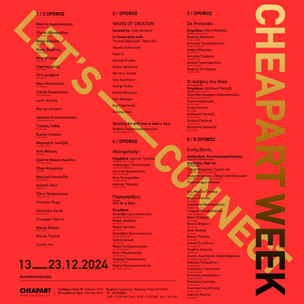 - CHEAPARTWEEK runs through December 23, 2024. Open 16:00 – 21:00, Sat./ Sun., 14:00 – 21:00. 66 Zoodochou Pigis st., Exarheia, Athens, 10681