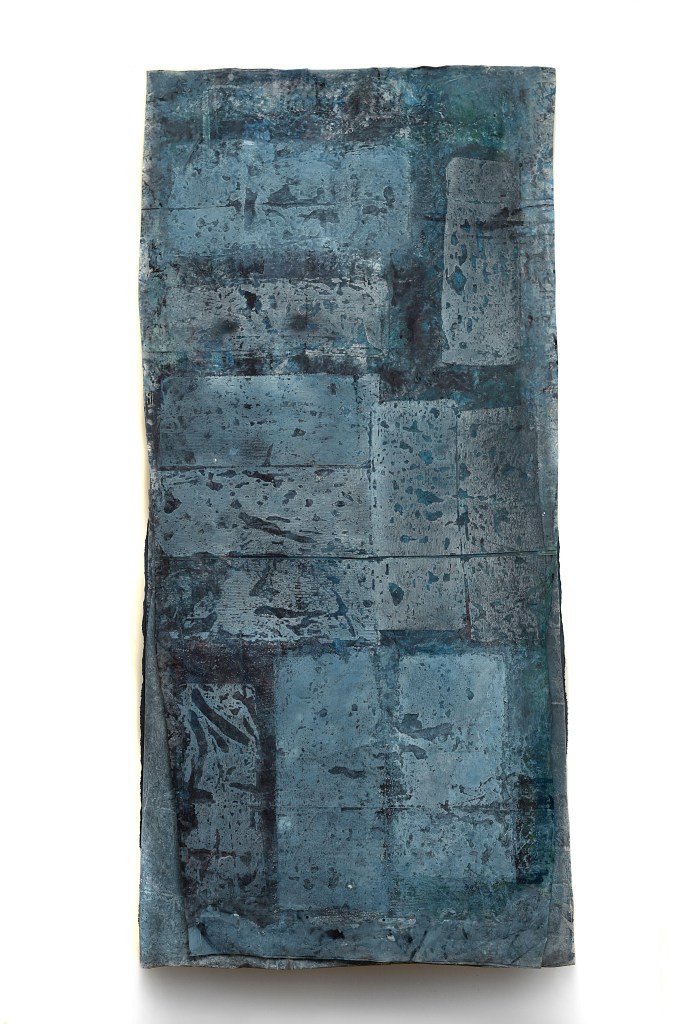 She selects fabrics for their colour, texture, and pattern. After dyeing them, the drying process influences their final form: laying them flat results in near-monochrome surfaces, while folding them on a horizontal plane produces unique patterns and a colour palette of varying shades of blue or green. The fabrics are then ironed and reinforced with interfacing – material used by seamstresses – to make them sturdier and less prone to wrinkling. This entire process is an exercise in polychromy through dyeing. The compositions vary: some include written elements, while others resemble masonry with visible joints. ‘These aren’t just colours; they are a kind of psychic energy,’ the artist emphasises, with the word ‘rhythm’ recurring in her reflections.