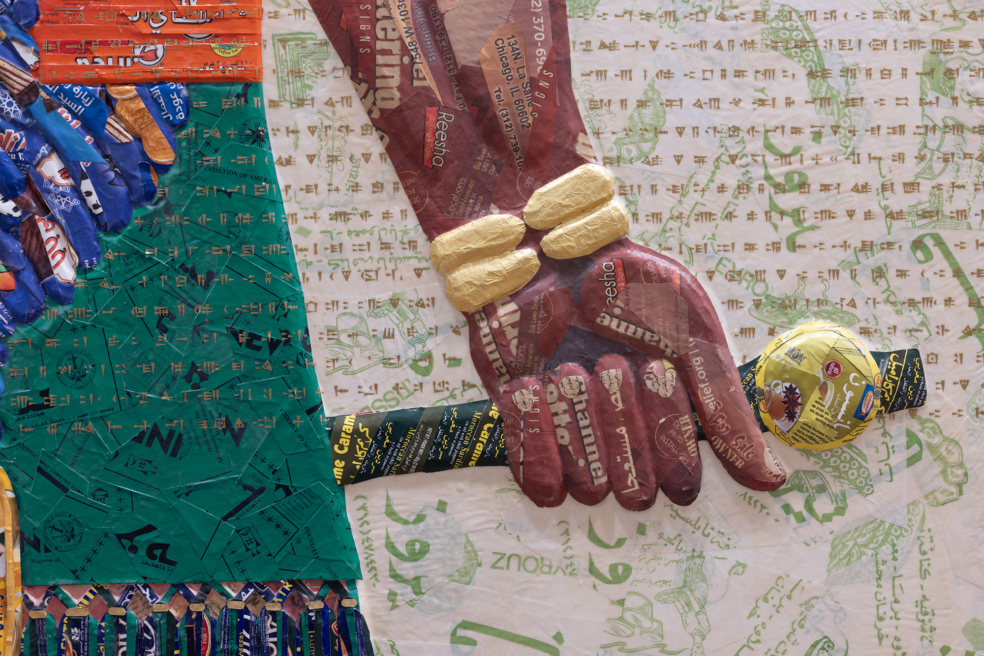 These works are made of papier mâché using Middle Eastern food packaging, Nineveh Magazine, published in Modern Assyrian and English, and Arabic-English newspapers found throughout the US, and bear deliberate visual absences and gaps. These disposable materials underscore the absence of the original objects that are missing.