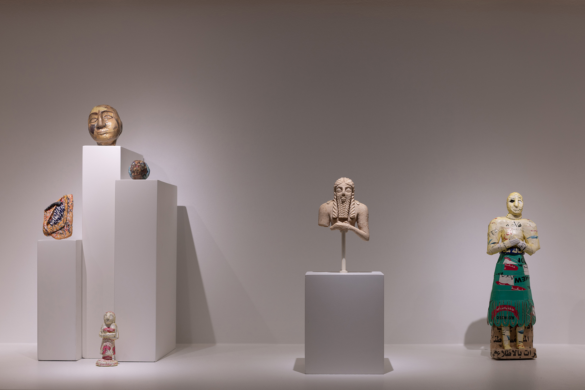 The exhibition presents ancient artefacts from the Middle East and southeastern Mediterranean, generously on loan: thirteen artefacts from the University of Chicago Institute for the Study of Ancient Cultures, and one from the Thanos N. Zintilis Collection of Cypriot Antiquities. These are shown in dialogue with many contemporary works from Rakowitz’s long-running series The invisible enemy should not exist). The works from the series The invisible enemy should not exist/ Northwest Palace of Kalḫu (Nimrud) are ‘reappearances’ of relief sculptures from the Northwest Palace of Kalhu (Nimrud) – historic Assyrian artworks that were looted or recently destroyed. These ‘reappearances’ are presented with empty spaces between them, echoing the damage of antiquity, war, and looting. Rather than concealing these cracks, the works embrace them, transforming trauma into testimony and absence into presence