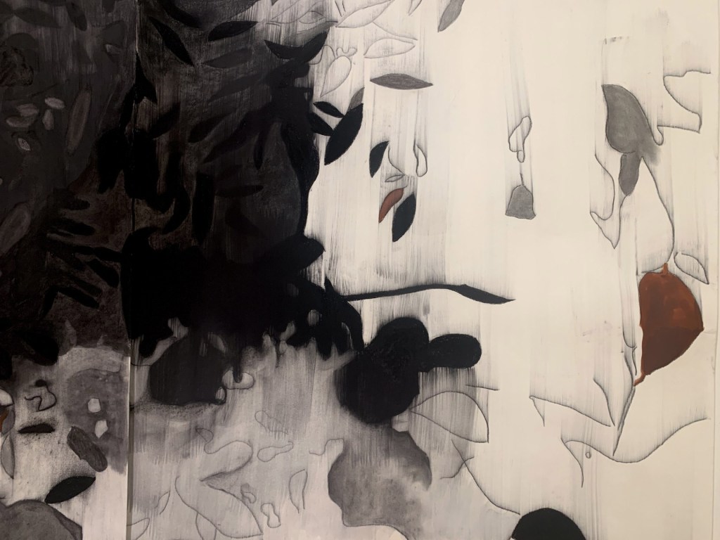 Mimma Scarpini is an Italian artist living in New York who creates with various visual media. Her work is characterized by both an abstract and figurative idiom, engaging in a dialogue with both the European figurative and abstract art traditions. The triptych drawing on paper entitled “Black Eden” depicts a burnt Garden of Eden, which, according to the Bible, was originally created by God as a Paradise for humans. The medium Scarpini uses, charcoal, is itself burnt organic matter (wood), intensifying the idea of the irreversible evil perpetrated by the human hand. In the mixed media work on paper Maria Mesa fleeing tear gas at the border, she is inspired by the Pulitzer Prize winning Kim Kyung Hoon’s photograph of migrants running away from tear gas at the border with Mexico. Hoon’s photograph captures a paradox, underlined by Scarpini’s use of color: as the woman and her children flee from tear gas, their shadows appear to move in the opposite direction, as though returning to the very place they are trying to escape. This aesthetic detail reflects key elements of the migrant experience: while they flee from danger and economic hardship, they also leave behind their culture and history—an identity that calls them back, like the irresistible pull of a siren’s song.