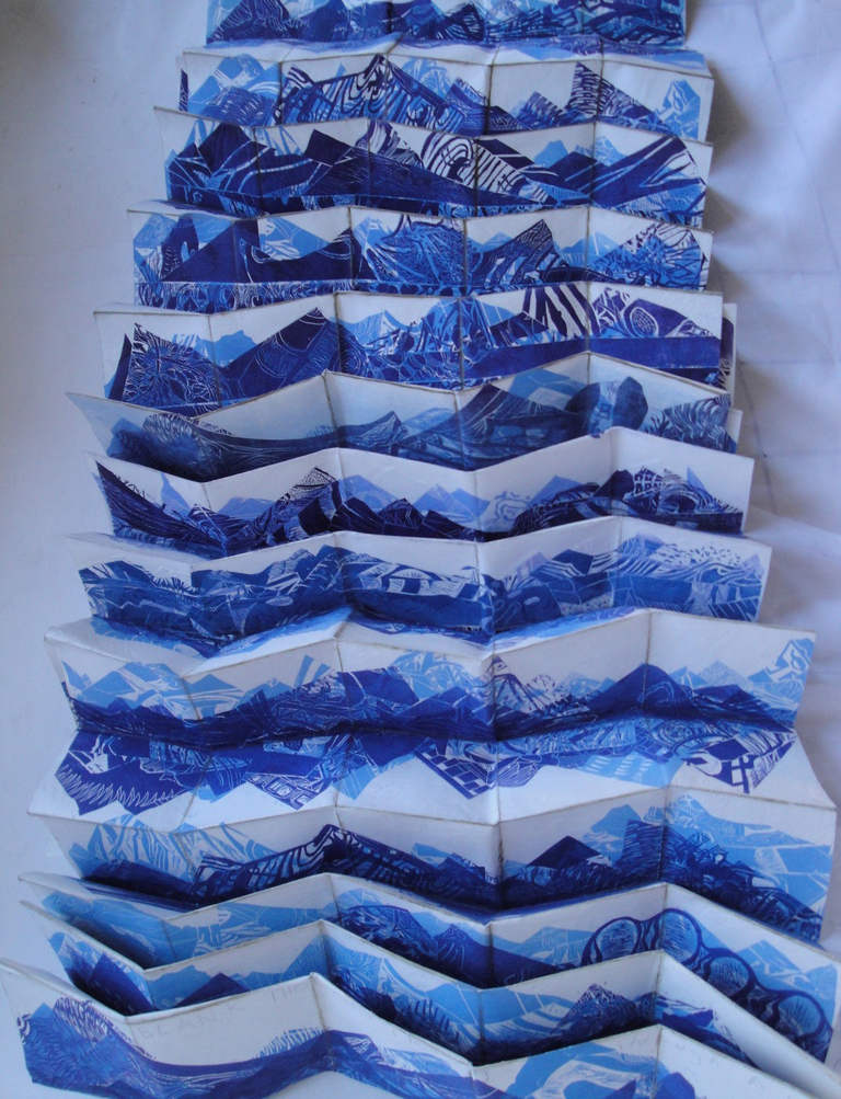 Tammy Wofsey’s art attempts to condense the essence of the natural world within the confines of paper. Paper acts as the conduit that gives life to all her prints. Her creative pursuit is guided by the goal of creating a deeply human connection to our environment and evoking a sense of slowing down over time. In this series the artist prints blue mountains on large flat paper, engraves them and folds them. According to the artist, the folded paper contains a memory that cannot be erased, telling a story that can be revived at any time with specific stimuli. Images evoke memories and vice versa, and connections between past and present are effortlessly activated: the smoke from the forest fires in California and Canada erases the artist’s memories of her home state of Colorado and the view from her apartment in the South Bronx, respectively. The viewers can pick Wofsey’s works in their hands and process them as they would flip through the pages of a memory-filled photo album. She hopes her work will give viewers the time to ‘slow down’, reflect, experience positive memories and aim for a better balance between their inner and outer worlds.